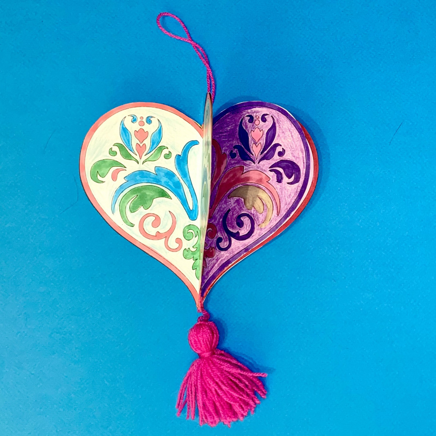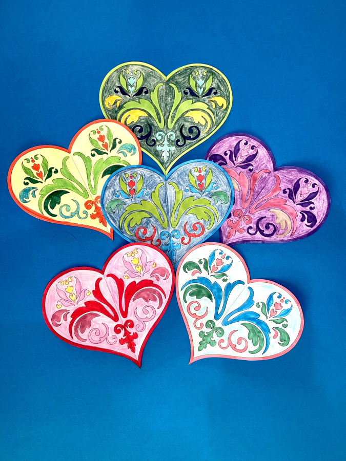 Эффектные украшения для класса и дома - объемные сердца, склеенные из 6 сторон с одинаковым орнаментом. Наиболее эффектно выглядят украшения, стороны которых раскрашены в одном стиле. Можно использовать краски с блеском, золотые и серебряные маркеры, объемные контуры, глиттер.