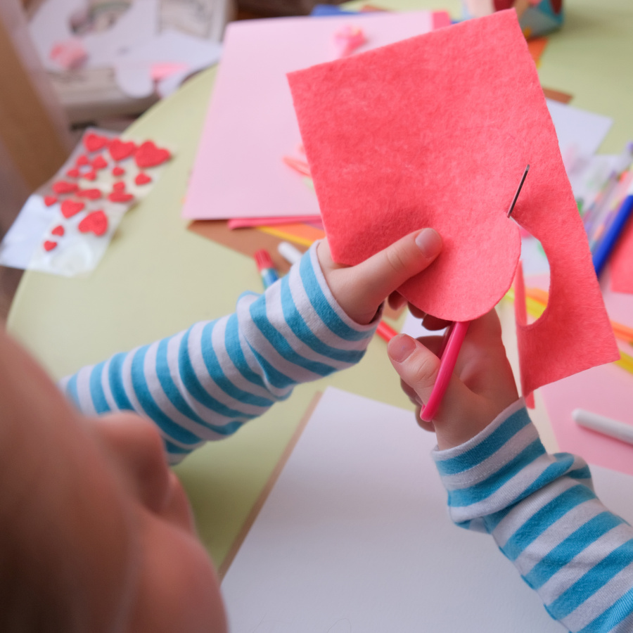 Наиболее удобный способ - предложить каждому ребенку в группе из 6 человек раскрасить одну сторону сердца, а потом собрать объемную фигуру.