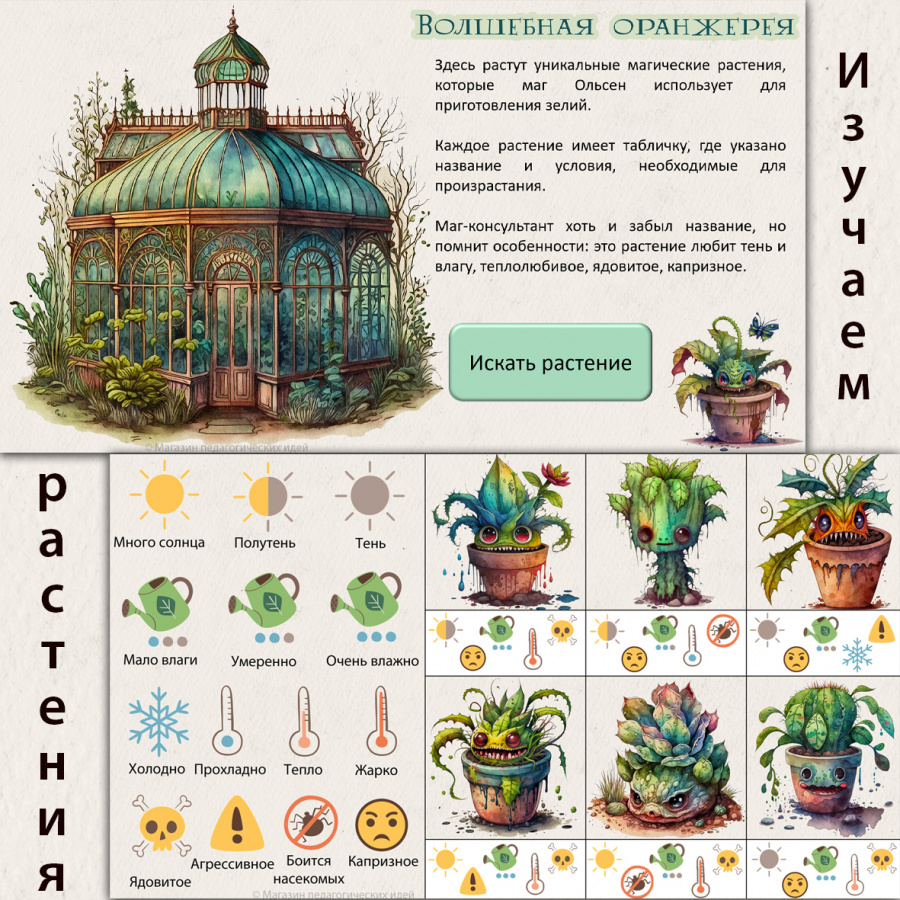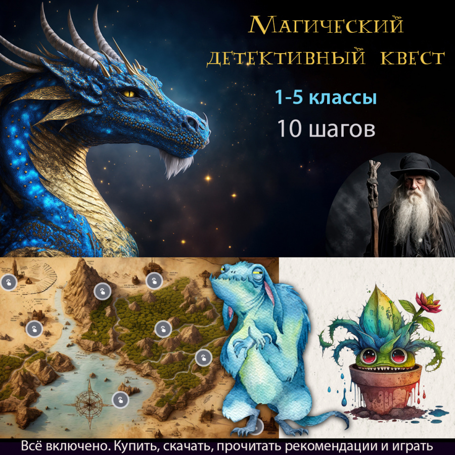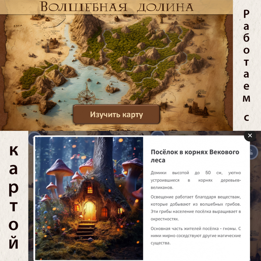 А еще, квест волшебный. И для того, чтобы это волшебство вошло в классы, искусственный интеллект озвучил немножко текста, а я придумала интерактивные элементы: диалоги с выбором реплик и ответами персонажа в зависимости от выбора, интерактивный определитель магических созданий, интерактивная карта Волшебной долины, интерактивное внутреннее пространство дома персонажа, где нужно найти кристалл. Немножко физической магии - проявляем симпатические чернила, чтобы получить пароль для доступа к письму от Деда Мороза. И еще потрясающие иллюстрации магических созданий, оранжереи с магическим растениями, мудрым и добрым драконом. И просто магическим антуражем, больше похожим на современную игру. Вот хочется мне, чтобы образование было ближе к детям ) А этот квест, он не только про развлечение, но и про обучение: работа и с информацией в различной форме, сравнение и анализ данных, смысловое чтение, удерживание цели.