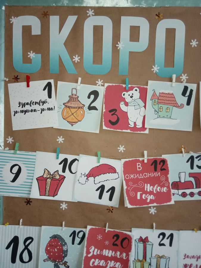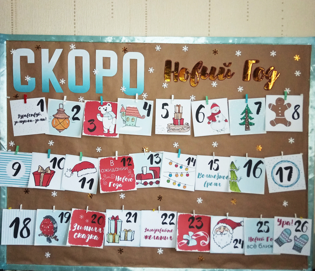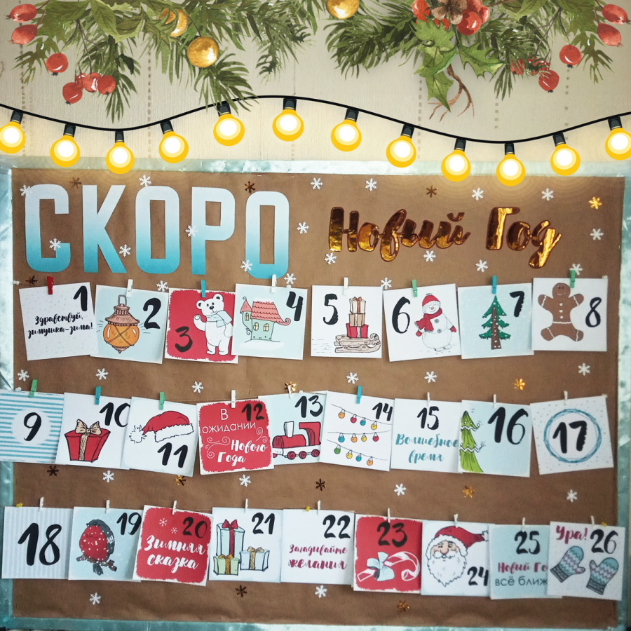 Элементы Адвент-календаря для класса крупные (15*20 см), чтобы всем ребятам было их хорошо видно. С помощью данного комплекта Вы можете оформить под Адвент-календарь пробковую доску или поместить его на ватмане и закрепить на стене.