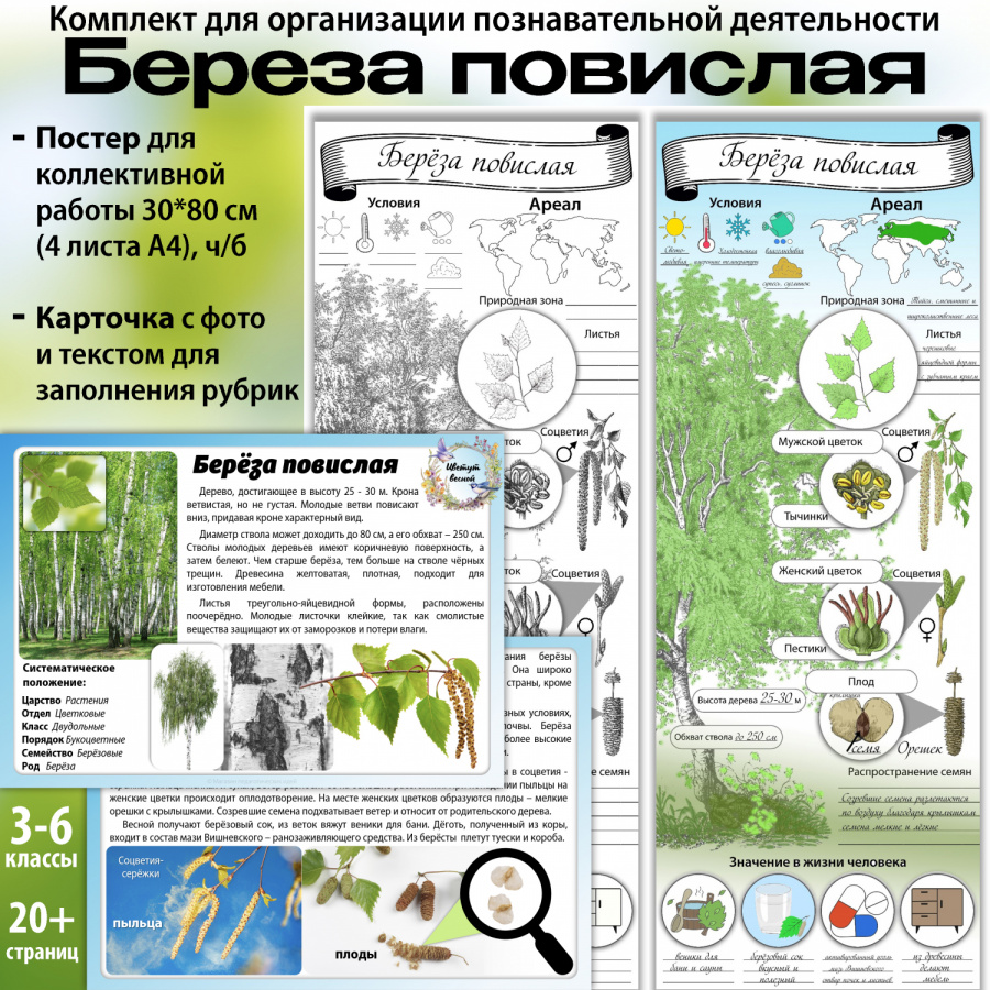 Изучить особенности растения Береза белая можно с помощью этого комплекта. В его составе постер 30*80 см (4 листа А4) и карточка с информацией для работы с постером.