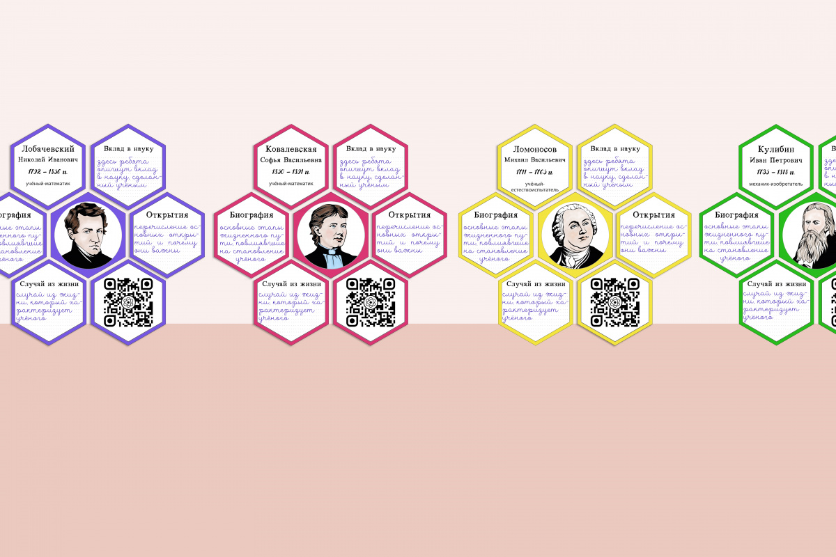 - Разложить шестиугольники с информацией вокруг портрета ученого и скрепить их скотчем с изнаночной стороны – получится постер, который можно использовать во время сообщения об ученом в классе или разместить на стене класса, в коридоре, рекреации как часть общей композиции.