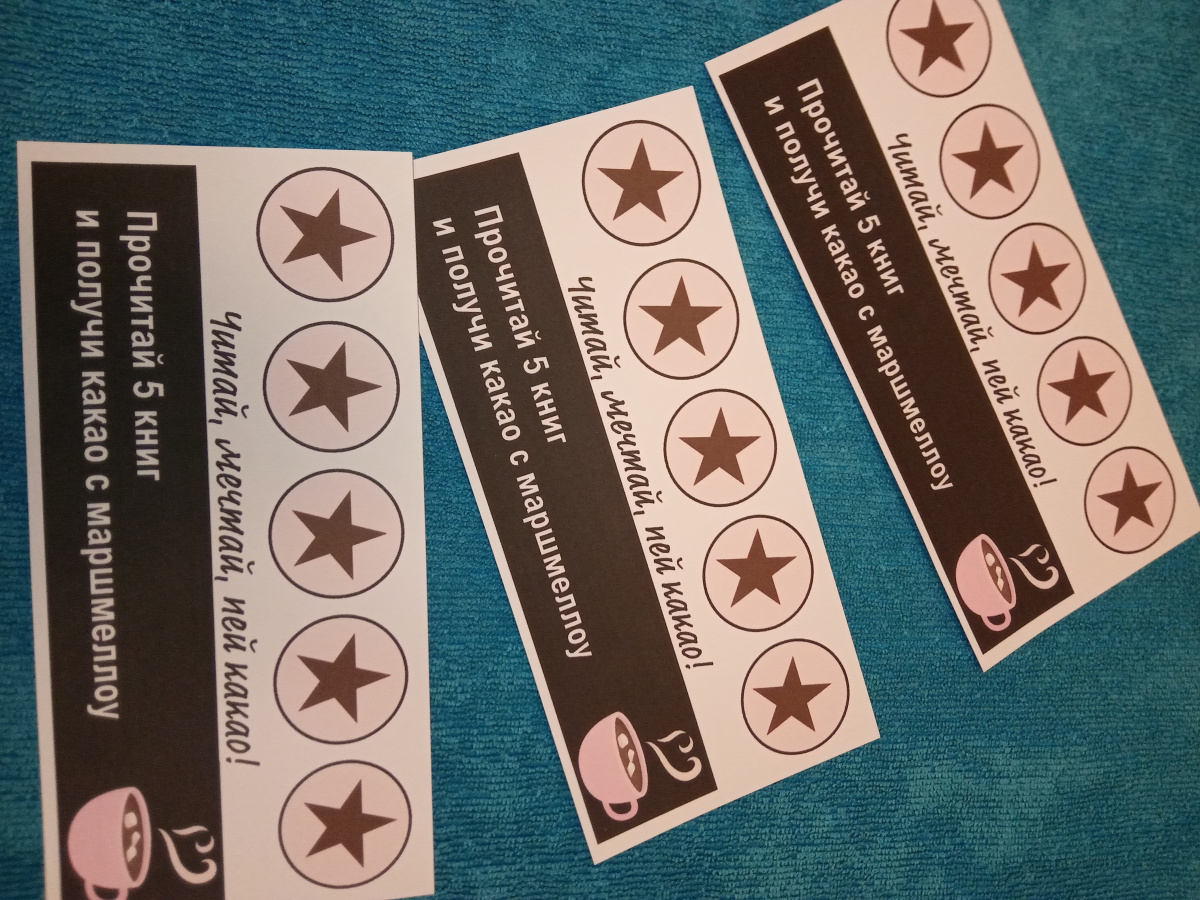 После прочтения книги ребенок заполняет отзыв на нее и вешает с помощью прищепки на натянутую бечевку, чтобы другие ребята могли увидеть отзыв, а учитель делает отметку в карточке участника (штамп или наклейка). Когда набирается пять отметок, ребенок получает какао с маршмеллоу и новую карточку.
