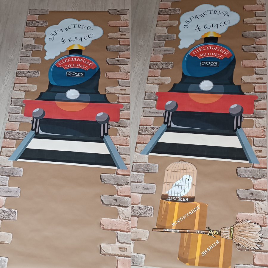 Он отлично подойдёт для оформления пространства ко Дню знаний, но при этом может «остаться» в классе на весь год. Декор с экспрессом будет интересен как поклонникам серии «Школа магии и волшебства», так и тем, кто далёк от данной тематики. Именно поэтому табличка с названием имеет два варианта.
