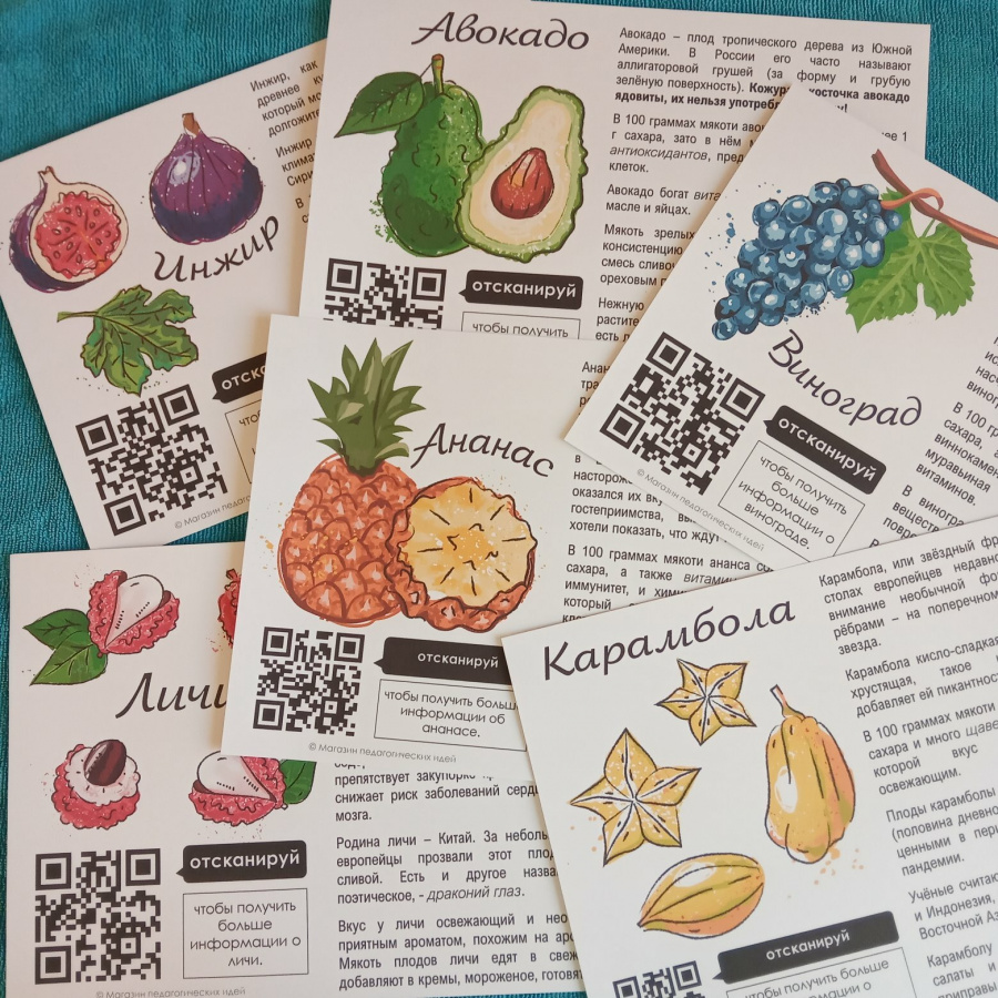 Яркие карточки с информацией о фруктах специально для начальной школы. На каждой карточке изображение фрукта, его название, тестовая информация (происхождение фрукта и местах его произрастания, содержание в нем сахаров, витаминов и микроэлементов, а также способы его употребления в пищу - если фрукт содержит ядовитые части, то информация об этом выделена для привлечения внимания ребенка), QR-код на страницу Википедии с дополнительной информацией о фрукте.
