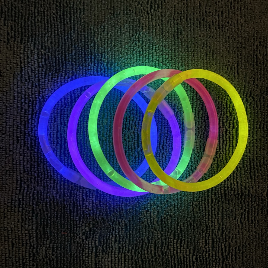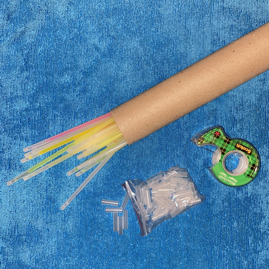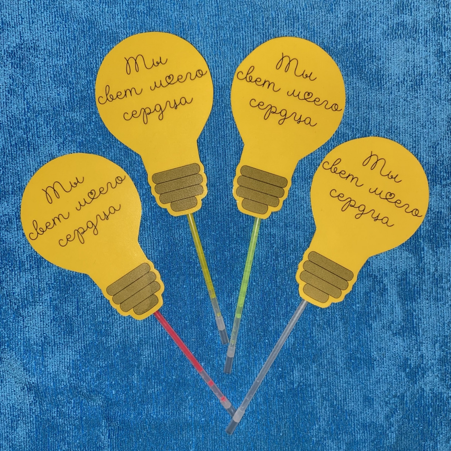 в комплект входят этикетки в виде лампочек с надписью, а также редактируемые этикетки. На фото лампочки, распечатанные на цветной бумаге и заламинированные. Палочка-браслет прикреплена к задней стороне этикетке кусочком скотча. Я сразу надеваю на палочку трубочку-переходник, с помощью которой палочка замыкается в браслет.