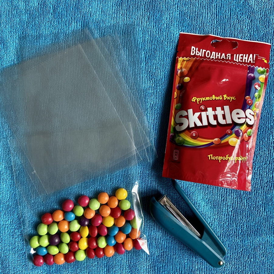 Вам понадобятся прозрачные пакеты около 14 см шириной, степлер, конфеты "Скиттлз" и распечатанные этикетки. Немного конфет в пакетик, закрепить края, чтобы конфеты не высыпались, этикетка сверху закрепляется степлером - и вот, милый подарок, от которого настроение так и поднимается вверх, готов!