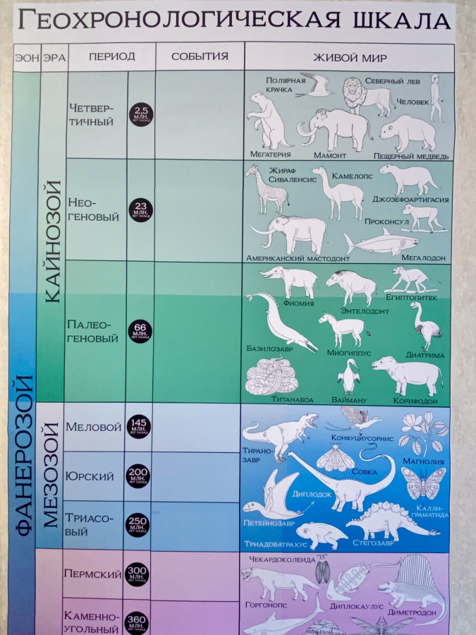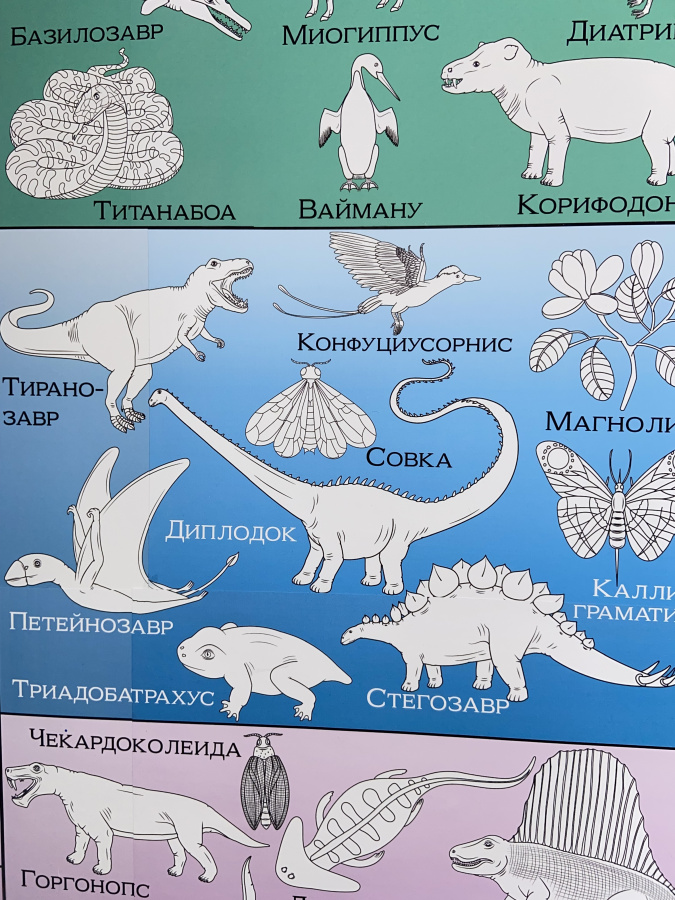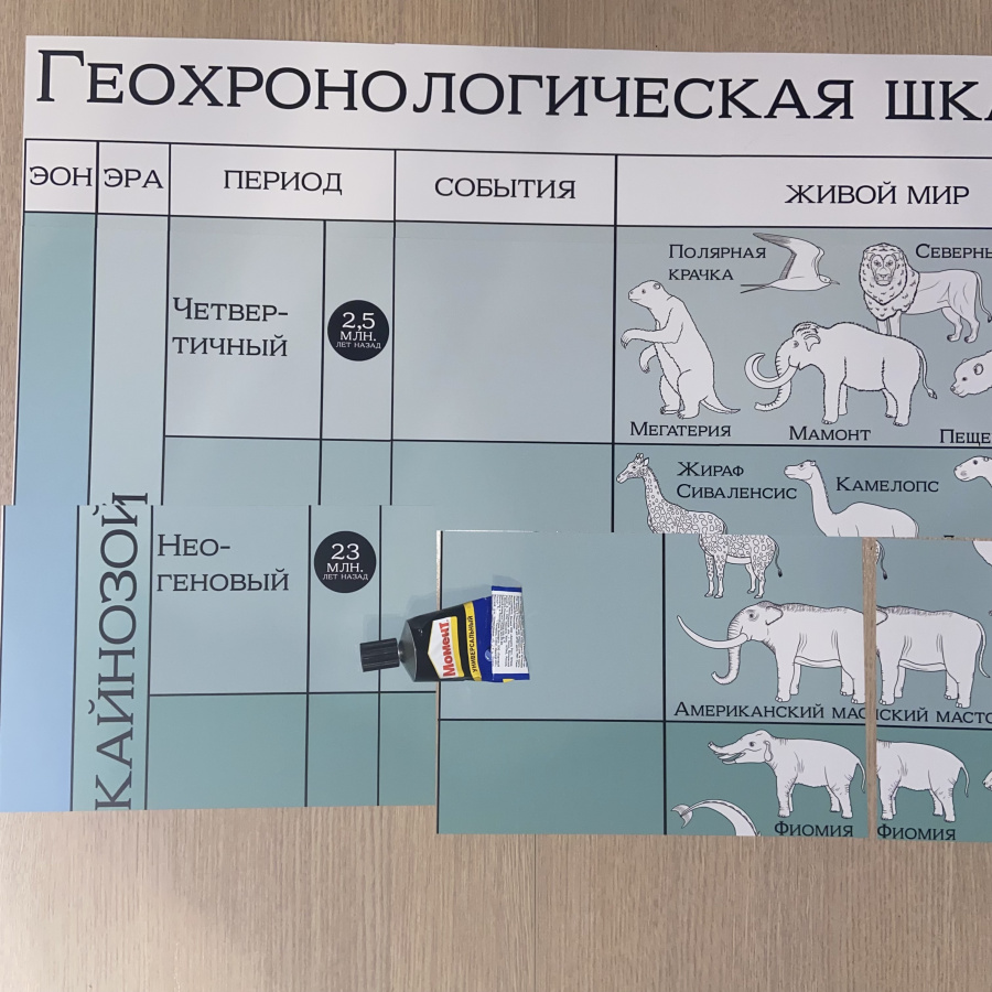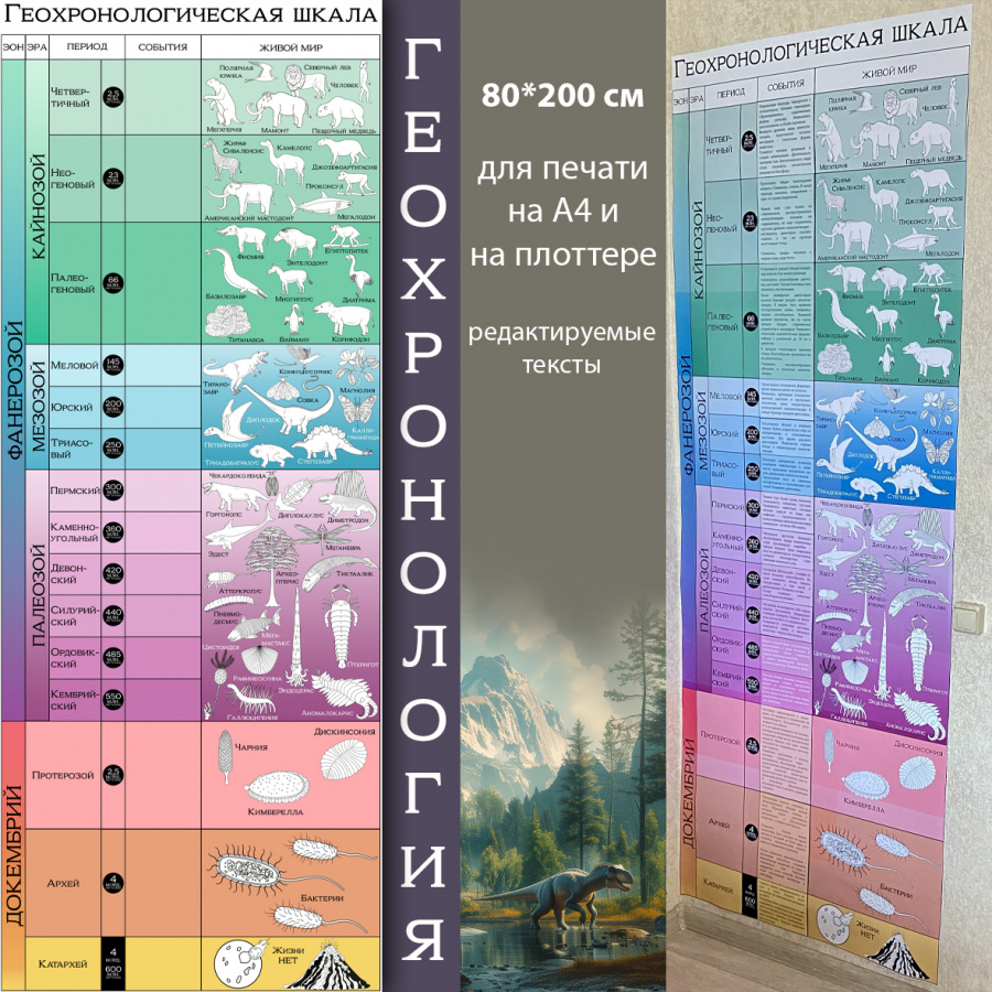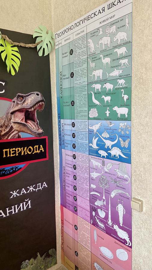 Вертикальная геохронологическая шкала занимает мало места. Ее можно разместить возле двери, на двери, в простенке между шкафами или окнами. При этом все ее элементы доступны ученикам. Ее цветовая гамма нейтральная, а изображения организмов, обитавших в разные периоды, контурные черно-белые. И при этом она выглядит привлекательно на стенах любого цвета.