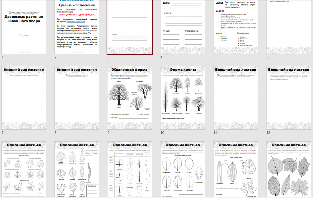 - пособие для учащихся (30 рабочих листов с инструкциями и контурными рисунками для проведения исследования, из которых впоследствии собирается папка или баннер для стендовой защиты)
