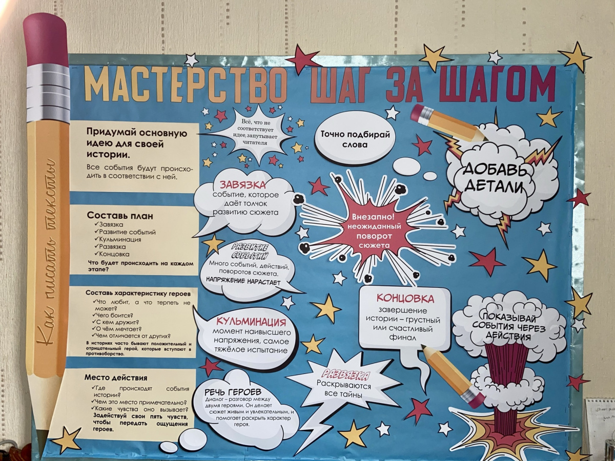 Задания дня помогают обеспечить большую часть перечисленных условий. А вот возможность оформить специальную доску (а может быть дверь в класс) появилась только сейчас. И эта доска поражает воображение - она приковывает к себе взгляды, сразу хочется начать придумывать и записывать истории.