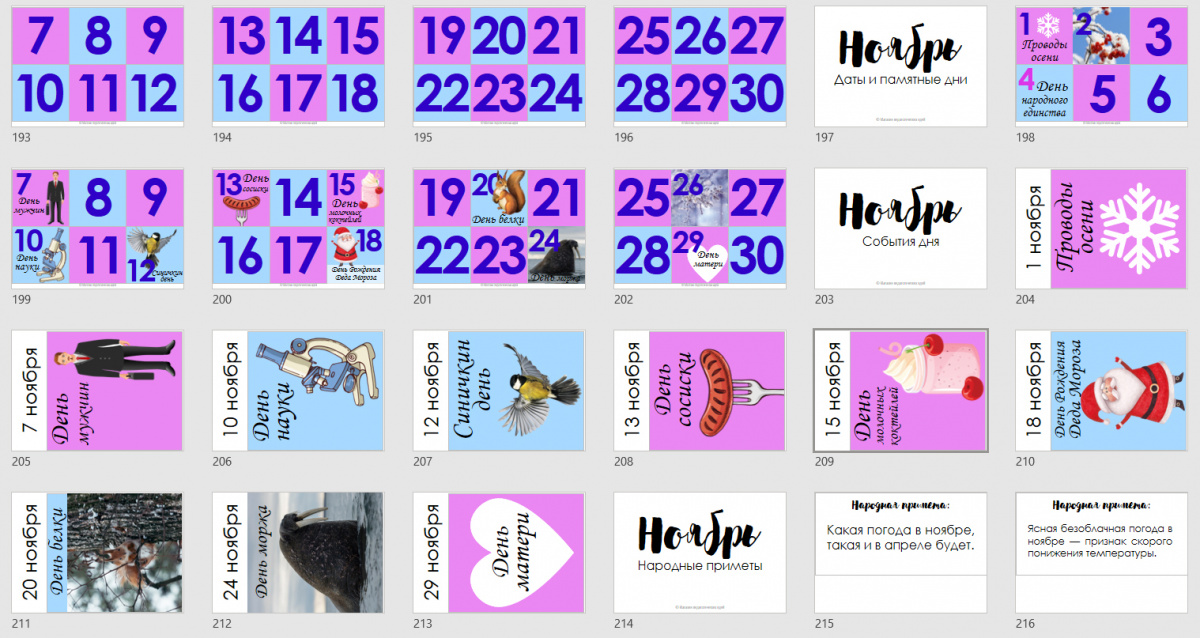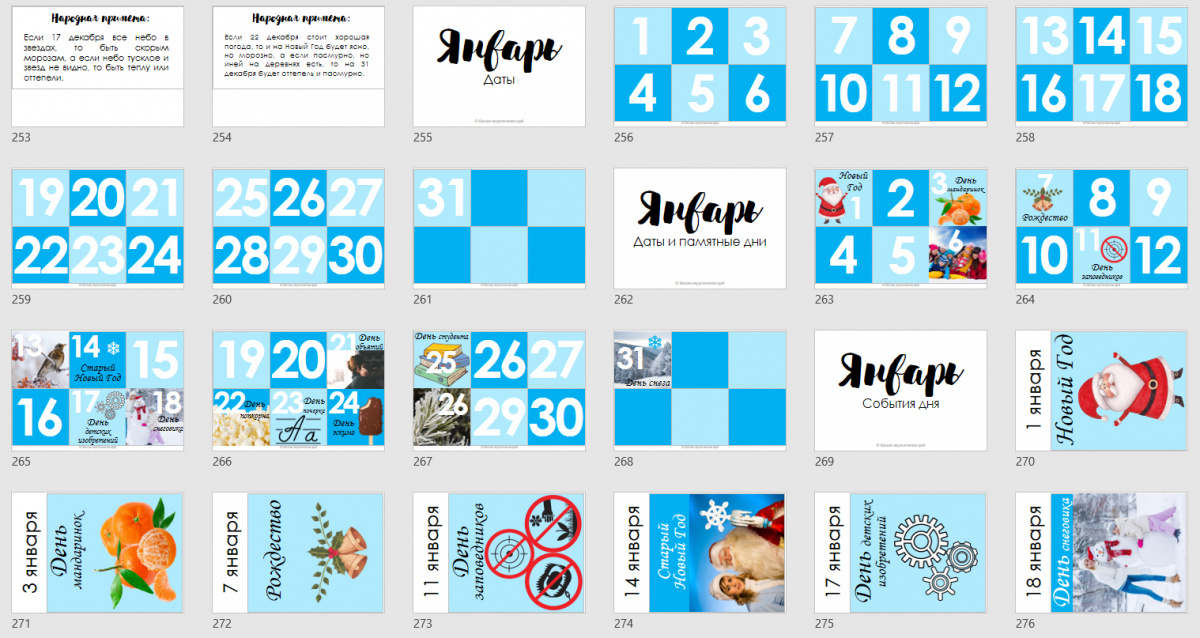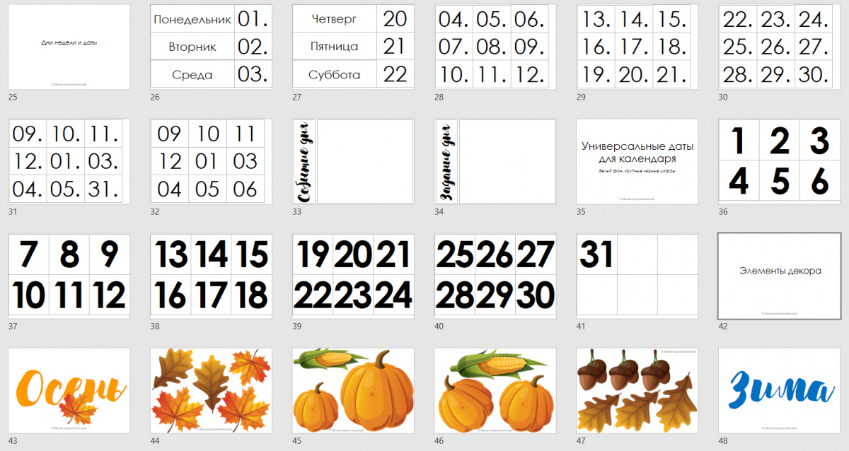 - для текущего дня - дата, день недели, сезон, месяц, событие дня, задание дня (комплект заданий дня приобретается отдельно);