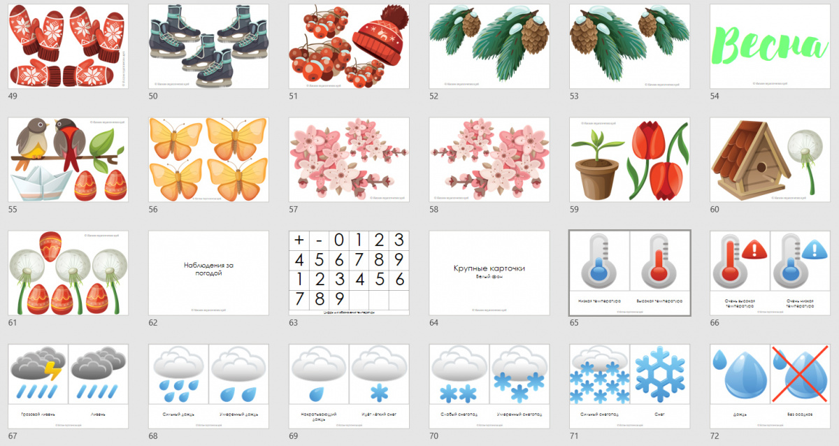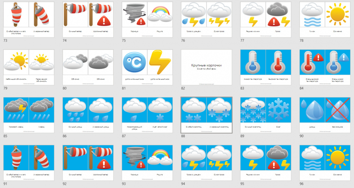 - наблюдение за погодой: облачность, осадки, сила ветра, температура - карточки для текущего дня (два размера, для каждого белый и голубой фон);
