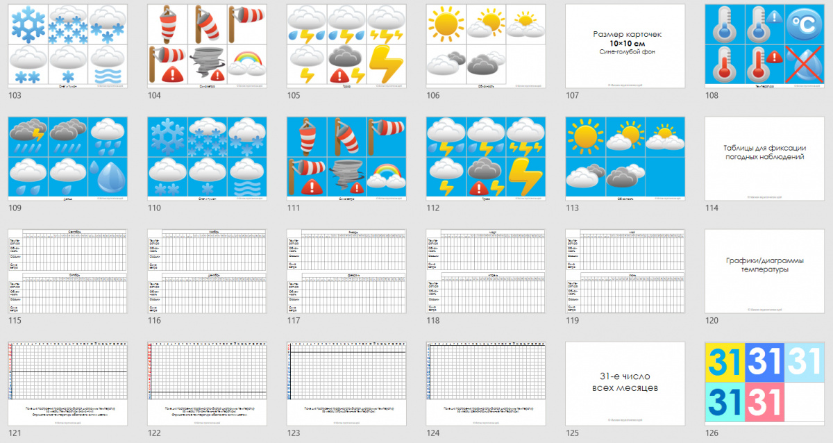 - обобщение наблюдений за погодой - таблицы на месяц, сетки для построения графиков/диаграмм измеенний температуры в течение месяца;
