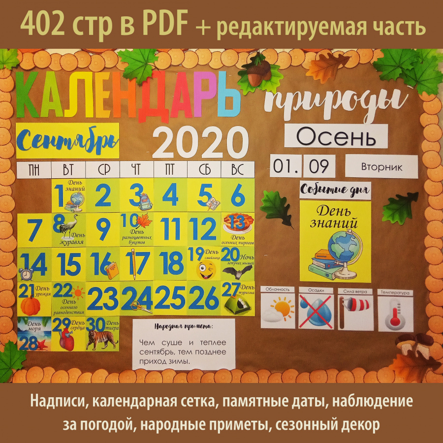 - календарь на текущий месяц (в комплекте 9 месяцев: сентябрь-май): универсальные даты на белом фоне, даты на цветном фоне без иллюстраций, памятные даты с иллюстрациями, ваши собственные даты - подлежат редактированию;