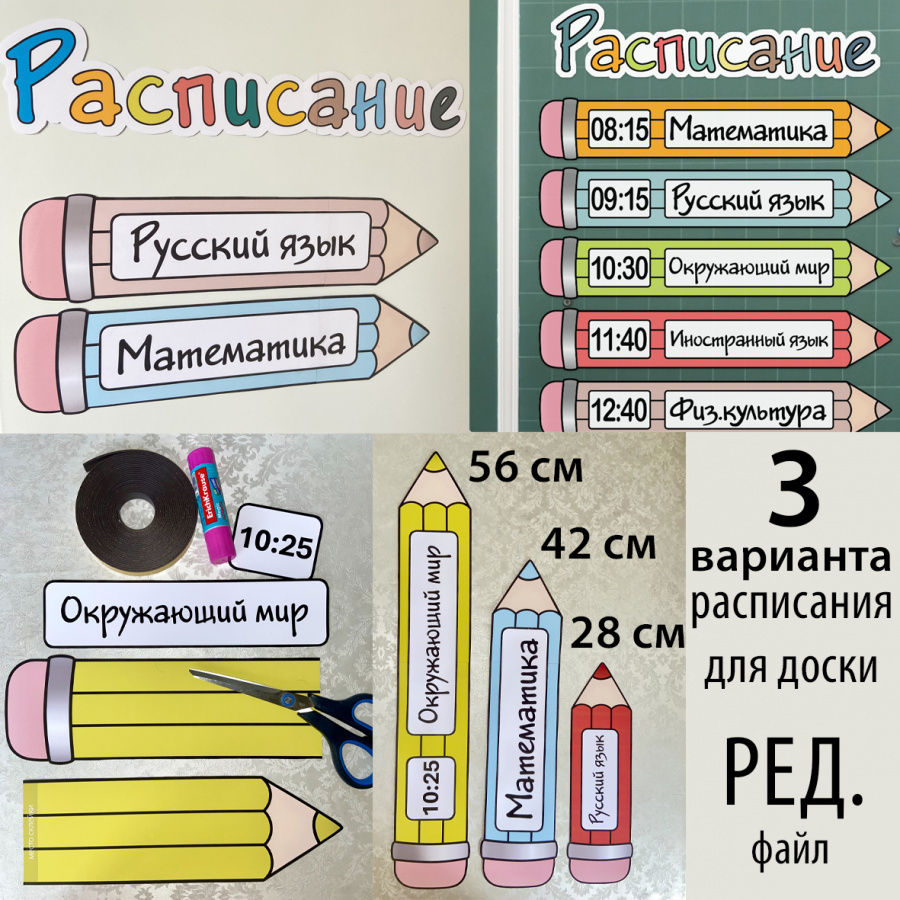 Карандаши в шести размерах, чтобы использование было максимально гибким. На фото примеры использования. Вы можете украсить класс длинными карандашами, они будут отлично смотреться наклеенными в нижней части стены, на створках шкафов и на стене над шкафами. Карандаши с белыми подложками (3 варианта) отлично подходят для расписания: вы можете использовать вариант с временем начала урока или без, выбрать более длинные карандаши или покороче, они подойдут для маркерной и меловой досок, и даже для пространства возле доски - закрепите их на стене, чтобы не занимать место на доске. На карандашах можно написать имена учеников и оформить дверь в класс - для этого в комплекте есть надписи "Добро пожаловать", "С возвращением", "В первый раз в первый класс" и даже вариант для детского сада есть - "Малыши-карандаши". Карандаши с именами можно использовать для быстрого распределения на группы во время урока, для "слепого" выбора ученика для устного ответа, для открытого голосования и других активностей. Карандаши с именами подойдут для маркировки локеров и кабинок в раздевалке. Причем, можно выбрать для этого карандаши побольше (4 на А4) и поменьше в зависимости от цели использования.