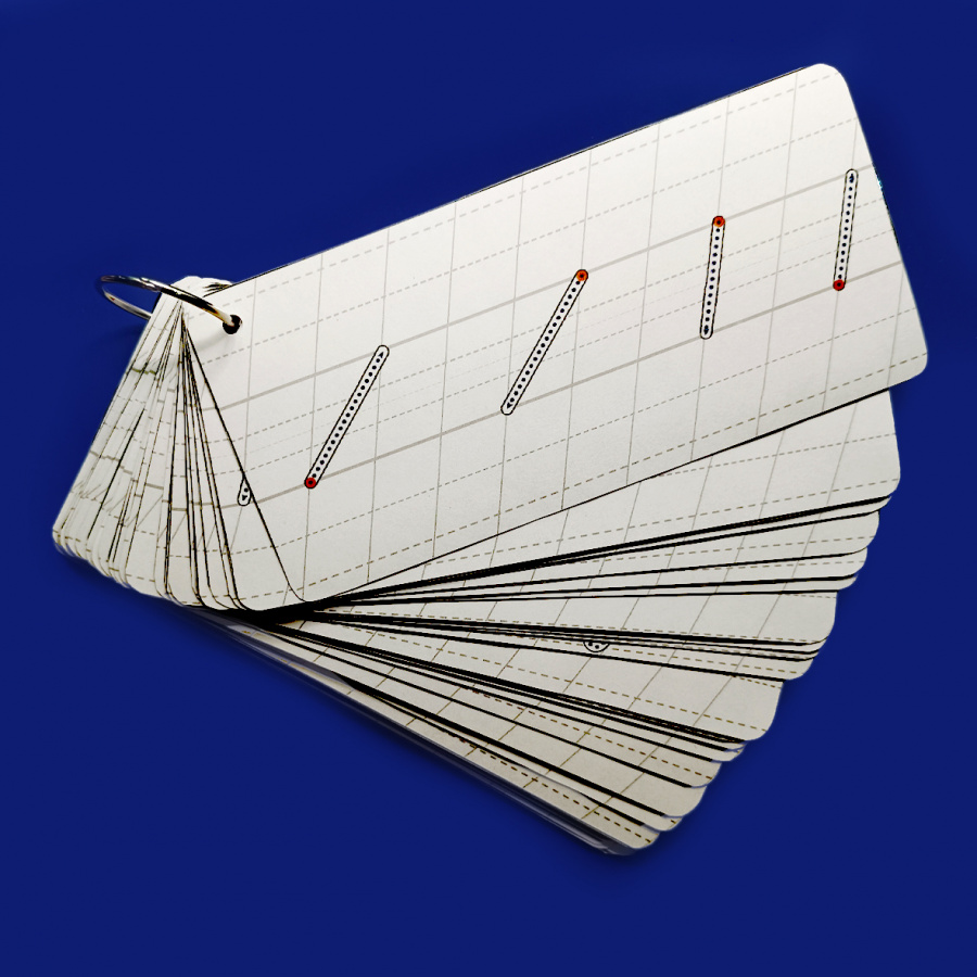 Буквы и элементы обозначены в виде обводки и контура с направляющими стрелками. Карточки представлены с двумя видами линовки: косая линия по типу «Чудо-прописей» и частая косая. Размер каждой карточки 9,5 х 20 см (по 3 шт. на листе А4).