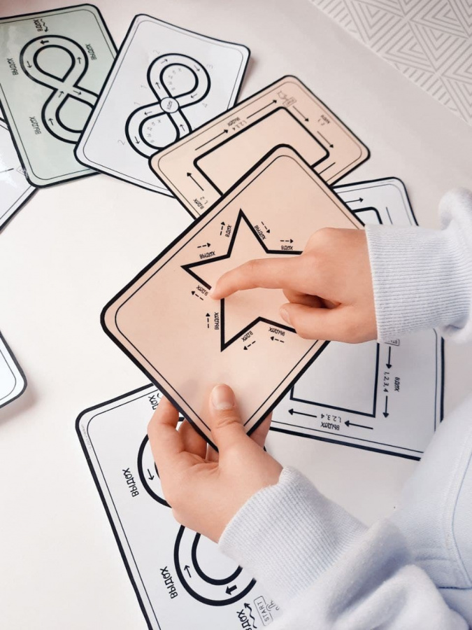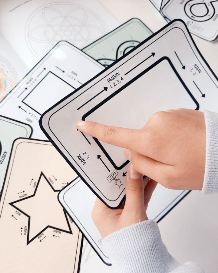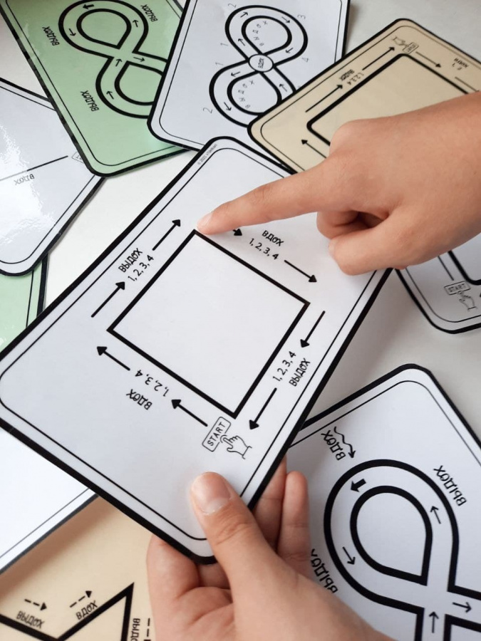 Чтобы выполнять упражнения, ваш ребёнок просто медленно обводит пальцем каждую форму, следуя стрелкам и подсказкам по ходу движения. Они продолжают отслеживать и дышать, пока не почувствуют себя спокойными и снова обретают контроль.