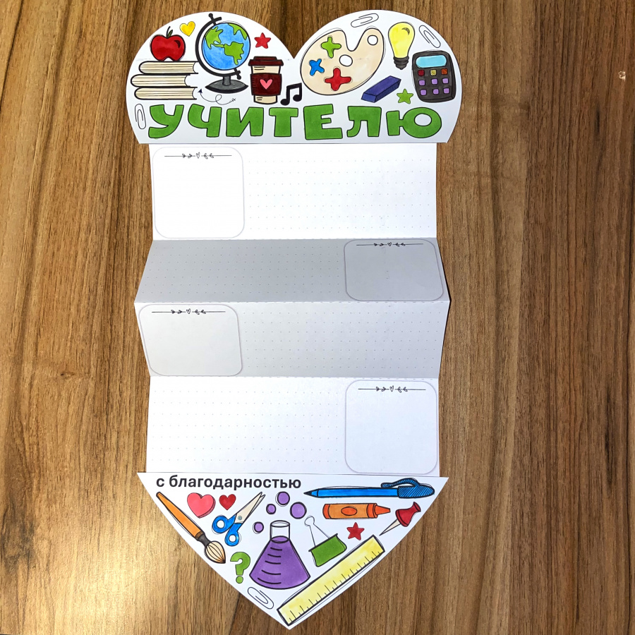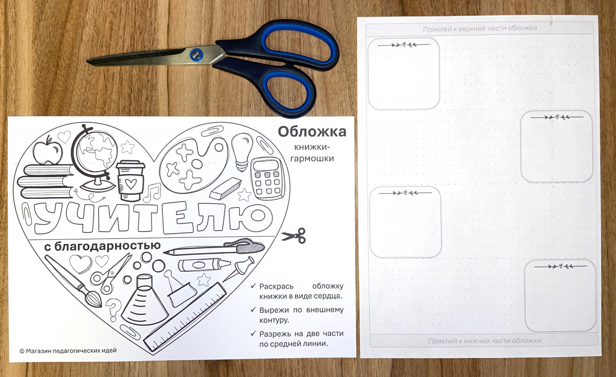 Эта эффектная книжка-гармошка станет милым подарком учителю от учеников. Необычный дизайн, простота сборки, экономичная черно-белая печать. Она выглядит так привлекательно, что руки так и тянутся, чтобы начать раскрашивать. В качестве бонуса я добавила простую открытку в виде сердца в двух размерах (1 сердце на А4 и 2 на А4), на них можно написать добрые слова, пожелания и благодарности, а так же прикрепить на оборот конфетку/шоколадку.