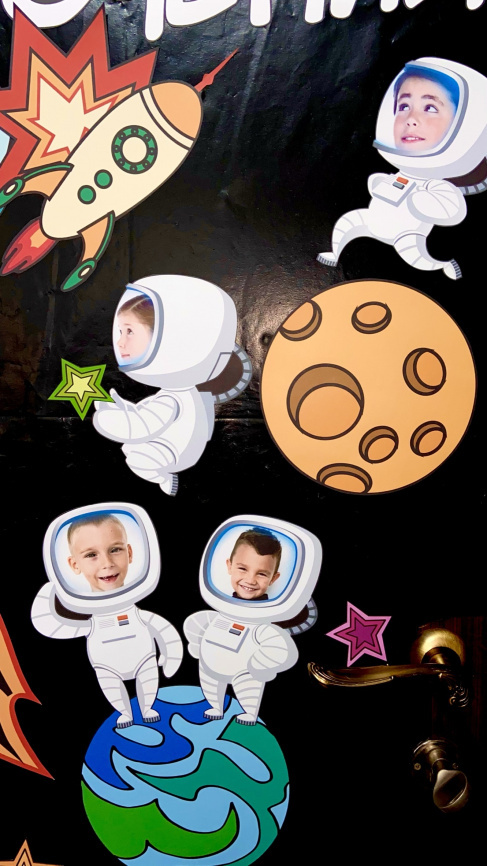 Декор подходит как для двери, так и для оформления пробковой доски, стен и любых других вертикальных поверхностей. В отличие от стандартного декора двери, этот комплект не имеет ограничений по размеру: в зависимости от количества космонавтов и дополнительных элементов декора, а также плотности их расположения, Вам потребуется большая или меньшая площадь. На стандартную дверь (80 см ширина, 200 см высота) у меня поместилось 40 космонавтов, но дополнительных элементов при этом было совсем немного - в основном звезды и маленькие планеты.