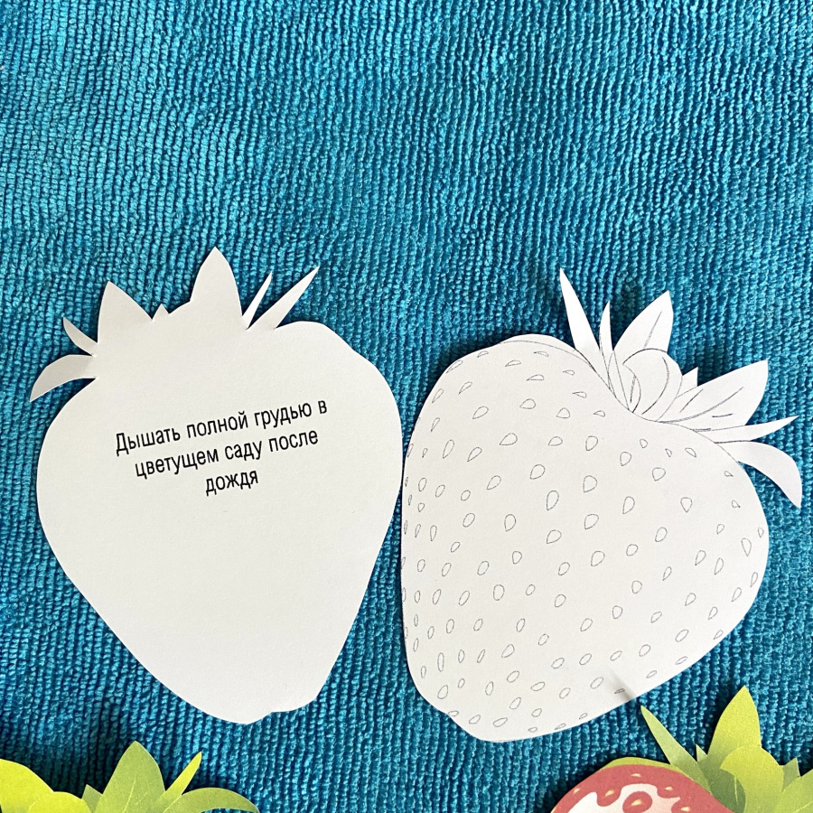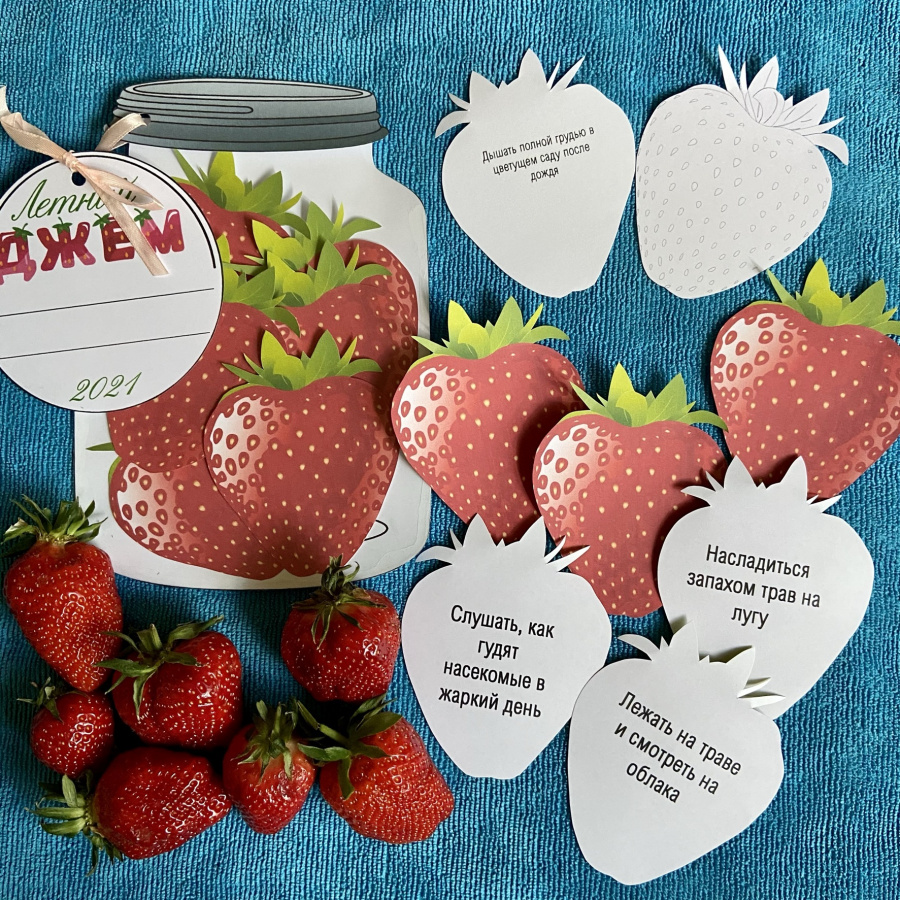 - Клубника (цветная и черно-белая) с летними заданиями: дети выполняют задания, вырезают (раскрашивают, если ч/б), записывают свои впечатления и дату, и складывают в баночку. Всего 60 заданий.