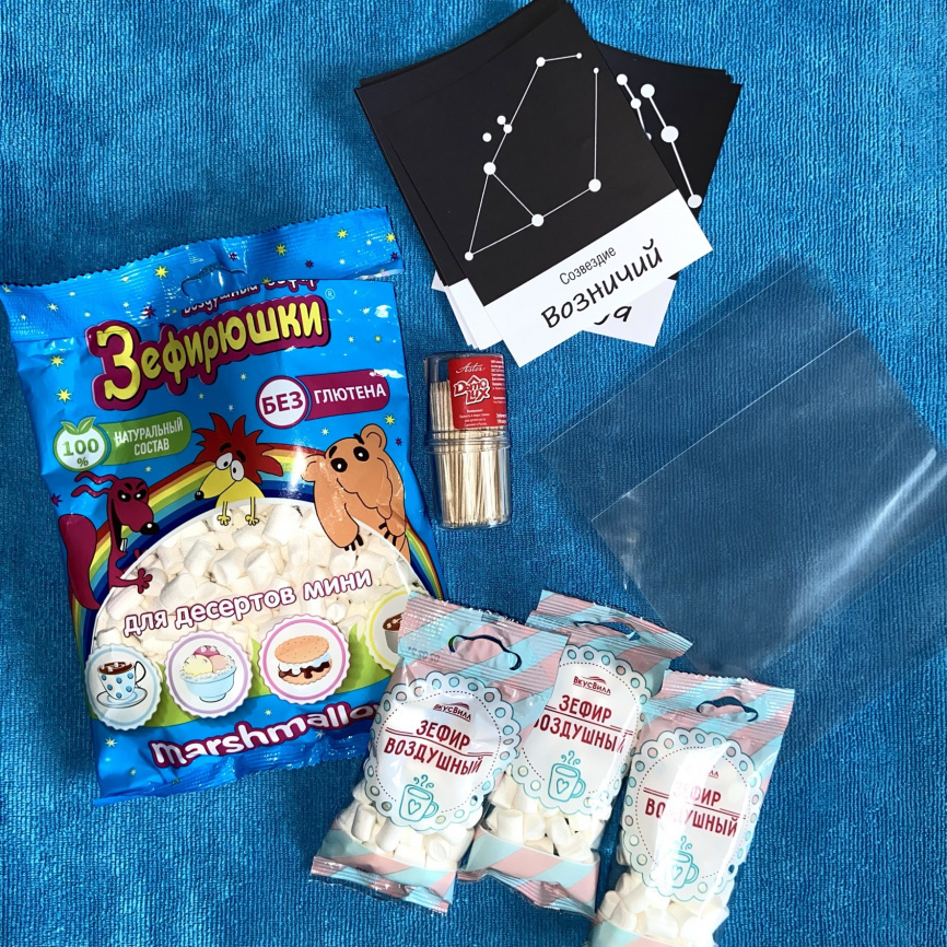 Если сформировать индивидуальные упаковки с маршмеллоу, зубочистками и карточками с созвездиями, то их можно дарить в качестве подарка на День Рождения в апреле или просто как поощрение. Такой подарок стоит не дорого, и в тоже время, доставляет неподдельную радость. Дети любят конфеты, а моделирование из конфет вызывает неизменный восторг.