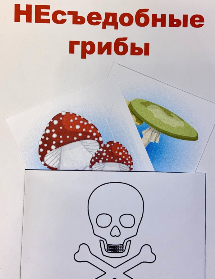 Данное пособие состоит из двух карманов (в виде корзинки для съедобных грибов и ведра для несъедобных) и маленьких карточек (8 шт на А4) с изображениями грибов. Задача – распределить грибы на группы: съедобные и несъедобные, а также подписать их названия.