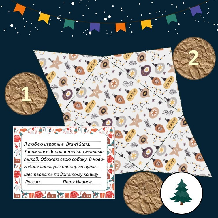 Правила игры просты. Учащиеся заполняют карточки, в которых описывают себя и указывают свои планы на Новый год. Карточки вкладываются в конверты-флажки, запечатываются и подвешиваются в виде гирлянды. Каждый день вскрывается конверт, а учащиеся должны угадать по описанию, о ком идёт речь. Угадавшие поощряются мелкими новогодними призами или конфетами.