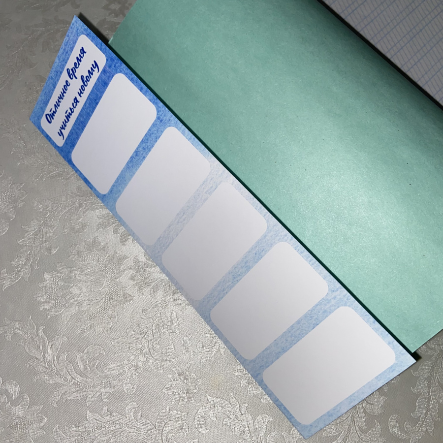 10 вариантов обложек и карточки для подписывания тетрадей, которые можно наклеить на обложку, всё в одном стиле. Стандартные графы для подписывания от руки, место для указания номера тетради, блоки для записей на внутренней стороне обложки с надписью "Отличное время учиться новому".