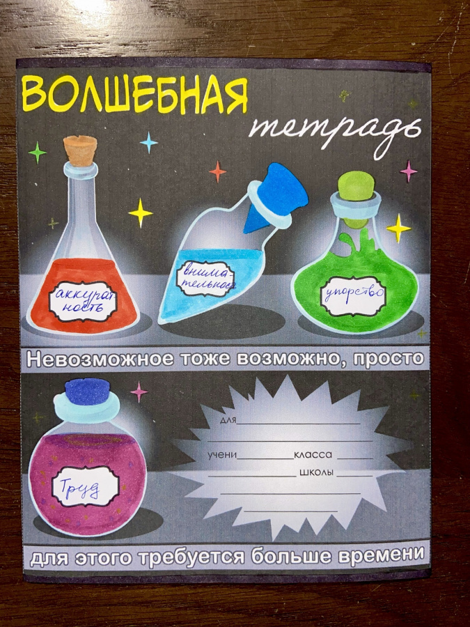Если Вы учите юных волшебников и бытовая алхимия Вам не чужда, предлагаю приготовить собственный эликсир успеха и записать его рецепт на обложке теради. Обложки-раскраски "Волшебная тетрадь" специально для этого!