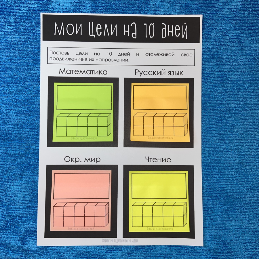 Наклейте на окошки подходящие стикеры – на них Ваши ученики будут записывать свои цели и отмечать продвижение. Можно использовать один стикер для каждого окошка на весь период, или наклеивать ежедневные стикеры поверх предыдущих.