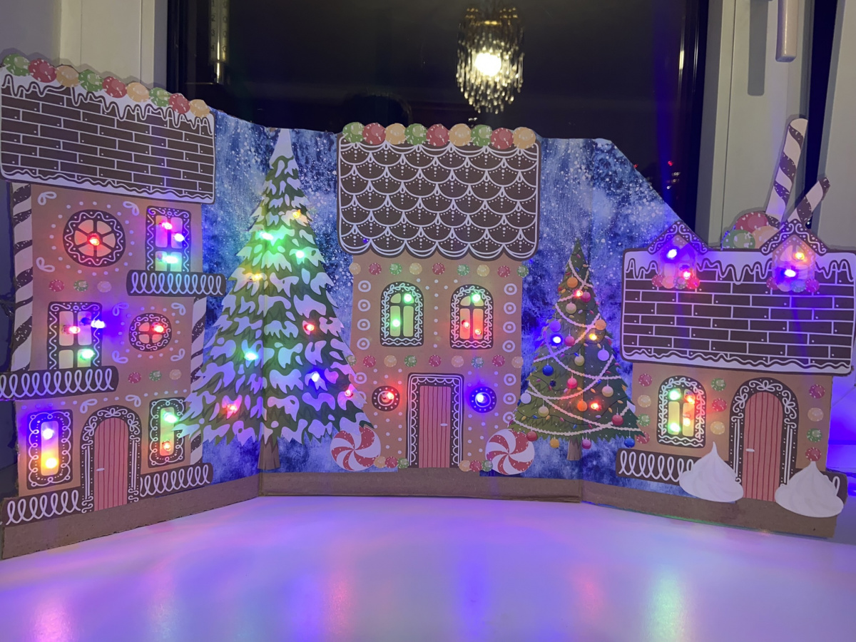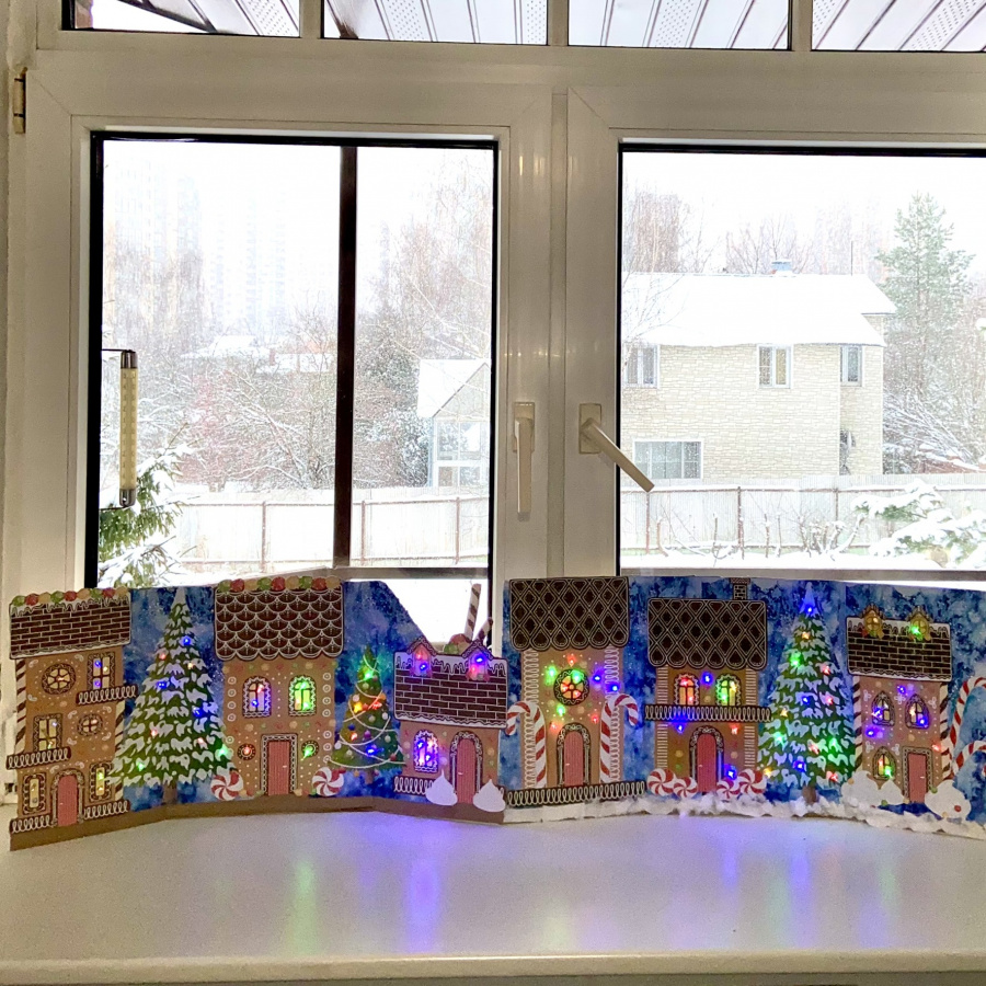 Эти пряничные домики просто бомба! Из них можно сделать панораму с гирляндой или витраж на стекло. Будет оформлен и подоконник и стекло каждого окна в классе и дома.