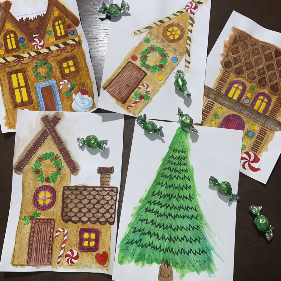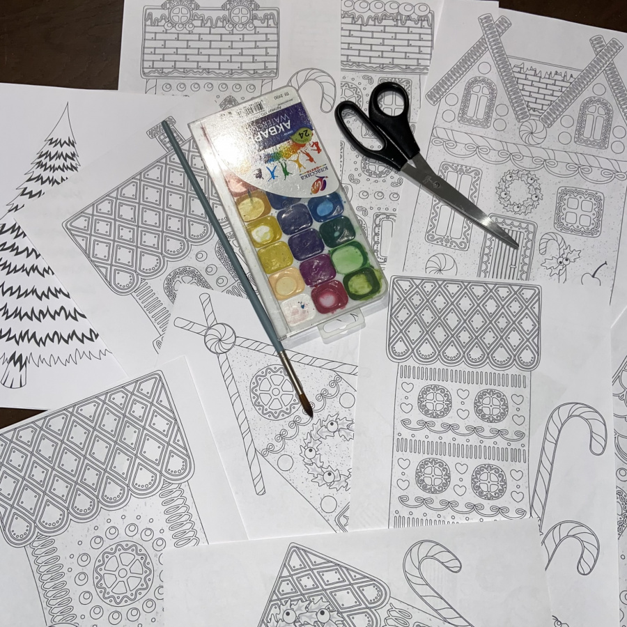 В комплект входит 8 вариантов цветных домиков на белом и акварельном (синий с белыми брызгами) фонах, а также ели (зеленая, под снегом и новогодняя), 12 контурных рисунков пряничных домиков для самостоятельного раскрашивания + ель универсальная.
