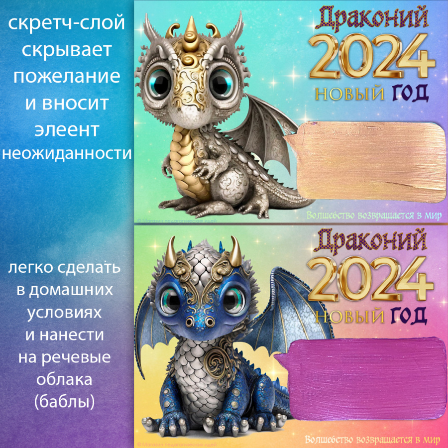 Открытки с предсказаниями "Драконий год" - это продукт в электронном виде (файл PDF + редактируемые баблы в PowerPoint). Скачать можно в личном кабинете - сразу после оплаты или в любое удобное время.
