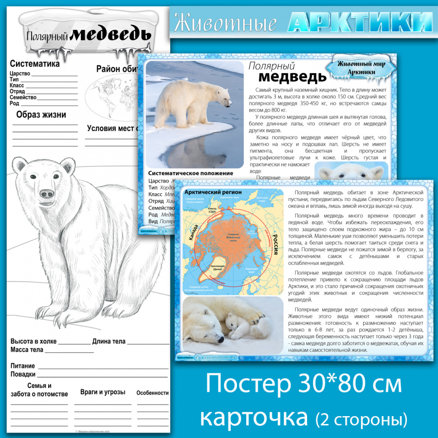 Каждая карточка содержит фото животных Арктики, карту и адаптированный текст. Информация представлена кратко, без «воды». Карточки можно распечатать на обеих сторонах одного листа или на отдельных листах. Лучше использовать матовую фотобумагу или офисную бумагу плотностью 140-200 г/м2.
