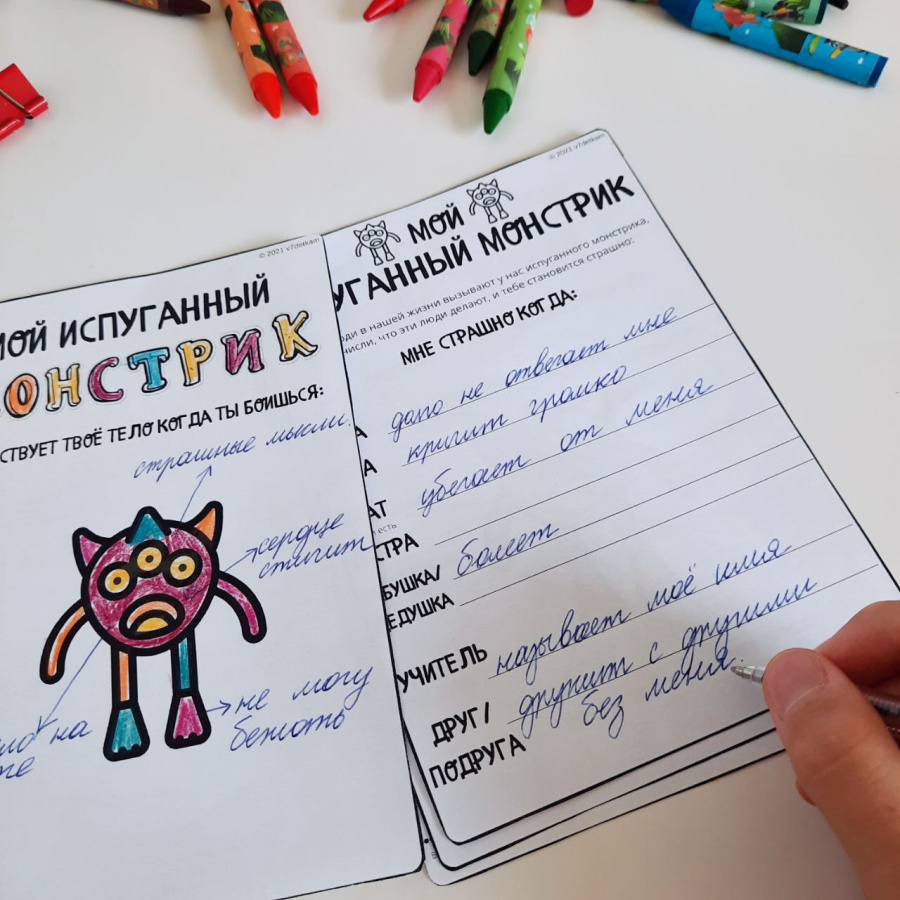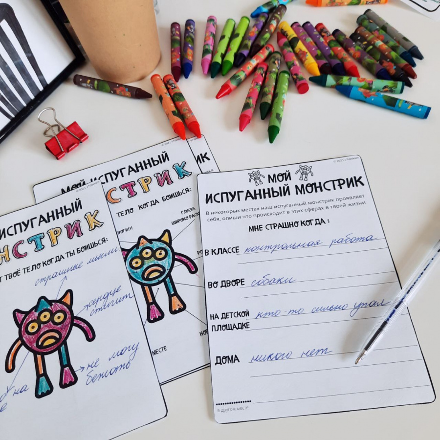 Раздайте материал монстрика (1 и 2). Покажите пример. «Это ваш эмоциональный монстрик, опишите, как вы ведёте себя или действуете, когда испытываете эту эмоцию, затем поделитесь с группой.