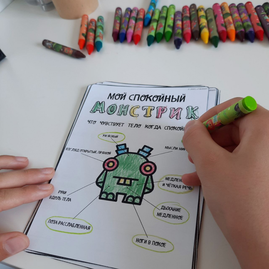 Каждый выражает свои эмоции по-разному. Когда тревожатся, некоторые люди начинают трясти ногами, некоторые скрипят зубами, некоторые сжимают кулаки, у некоторых возникает напряжение в груди. Определить, как мы выглядим, когда мы испытываем определенные эмоции, нам поможет упражнение "Мой монстрик" чтобы знать, когда мы начинаем испытывать определенную эмоцию (назвать тему занятия), и можем затем сделать что-нибудь, чтобы успокоиться.