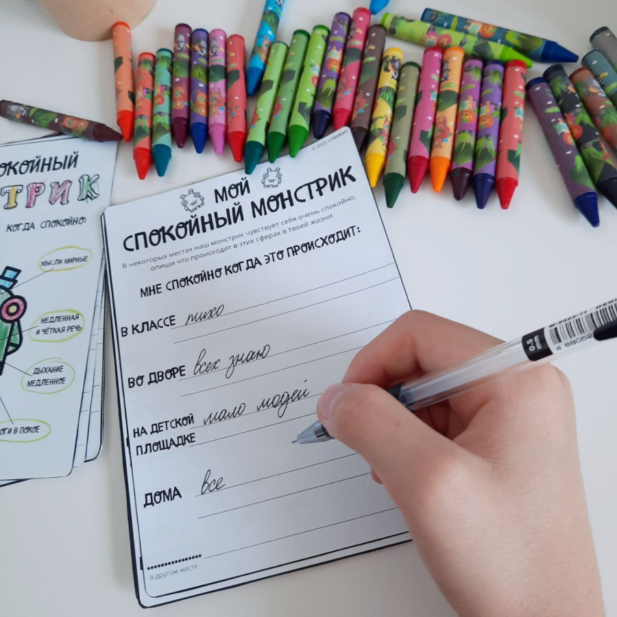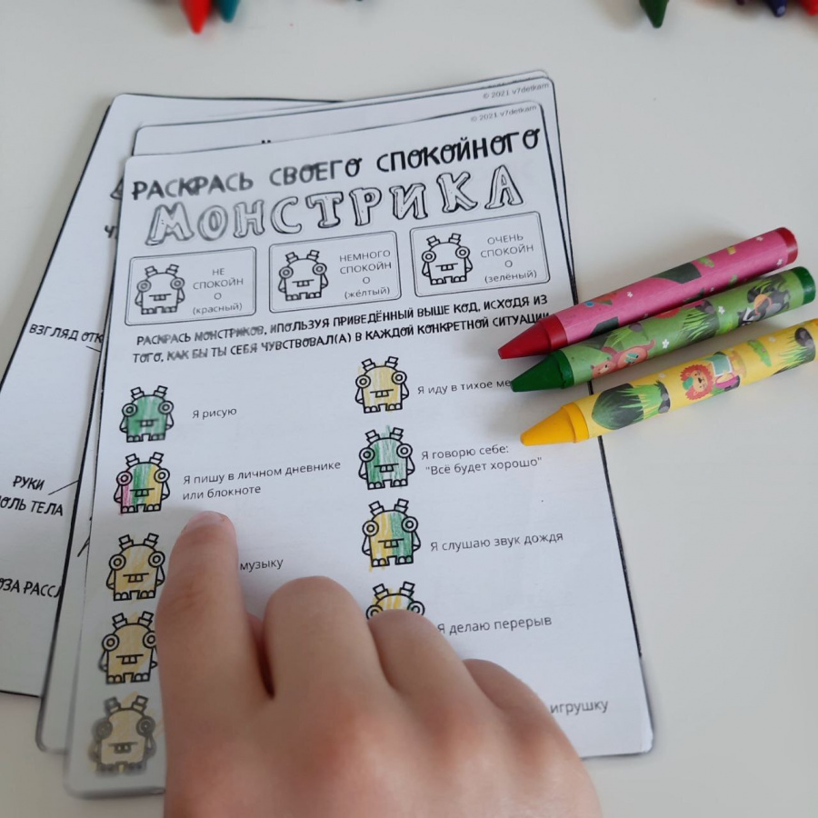Раздайте материал монстрика (1 и 2). Покажите пример. «Это ваш эмоциональный монстрик, опишите, как вы ведёте себя или действуете, когда испытываете эту эмоцию, затем поделитесь с группой.