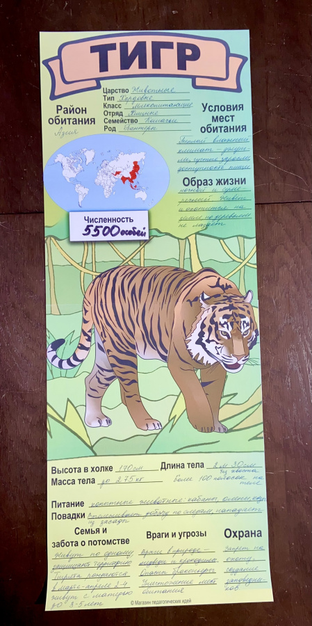 Постер с тигром из комплекта "Дикие кошки планеты" с карточками для заполнения всех рубрик.