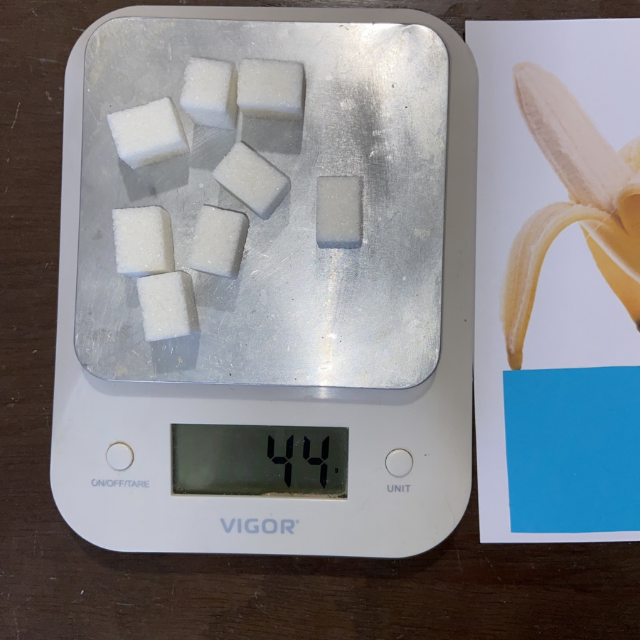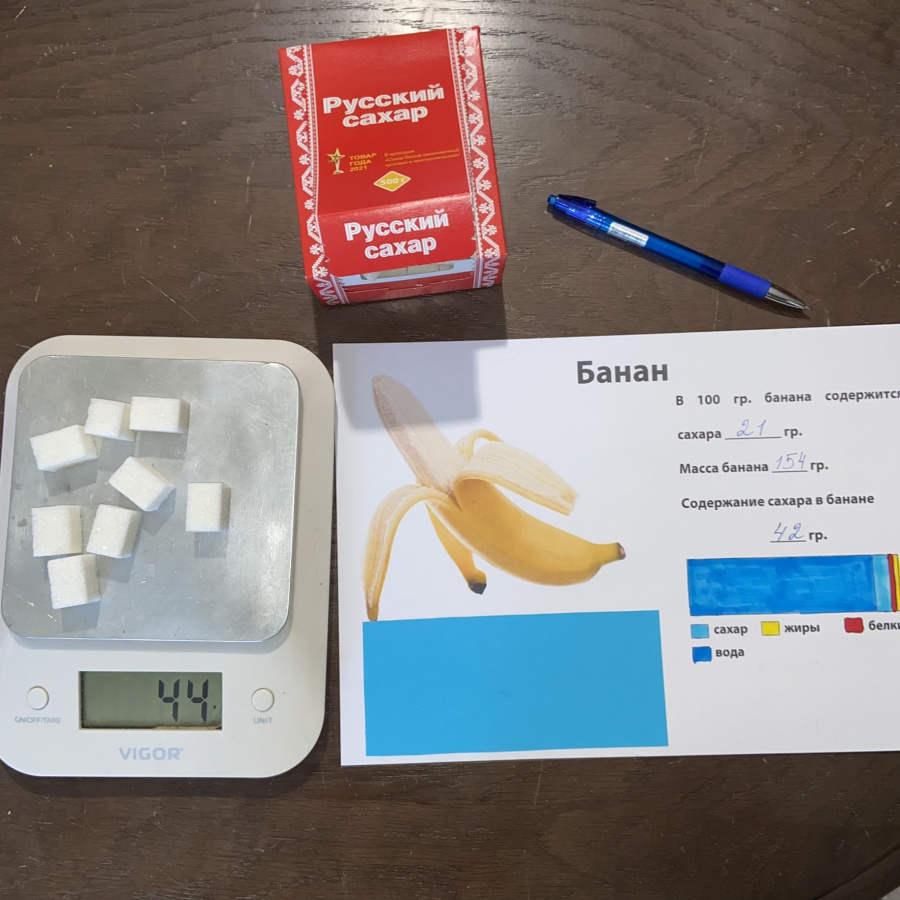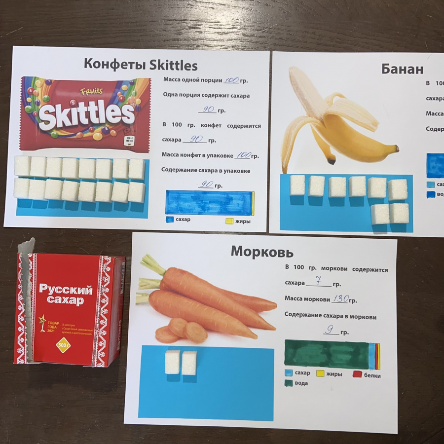 Ребята будут изучать упаковку продуктов питания (сладости), чтобы выяснить, сколько сахара (добавленный сахар) входит в их состав. А затем будут рассчитывать соответствующее количество кусочков сахара-рафинада и производить взвешивание на весах (обычные кухонные подойдут). Кубики сахара они закрепят на рабочих листах, раскрасят диаграммы и сопоставят количество сахара в этих сладостях и фруктах и овощах. особенно здорово, когда ребята сами приходят к выводу, сколько конфет можно съест в день, чтобы это не имело последствий для их здоровья, и каким количеством фруктов (или моркови) можно заменить любимые сладости.
