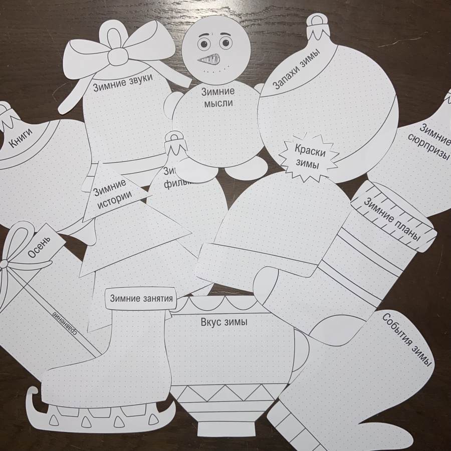 Элементы венка - елка, подарок, снеговик, елочные украшения, шапка, варежки, коньки с выполненными на них заданиями, наклеиваются на круг-основу. Можно предложить своим ученикам раскрасить все элементы или распечатать их на цветной бумаге, чтобы оформление заняло меньше времени.