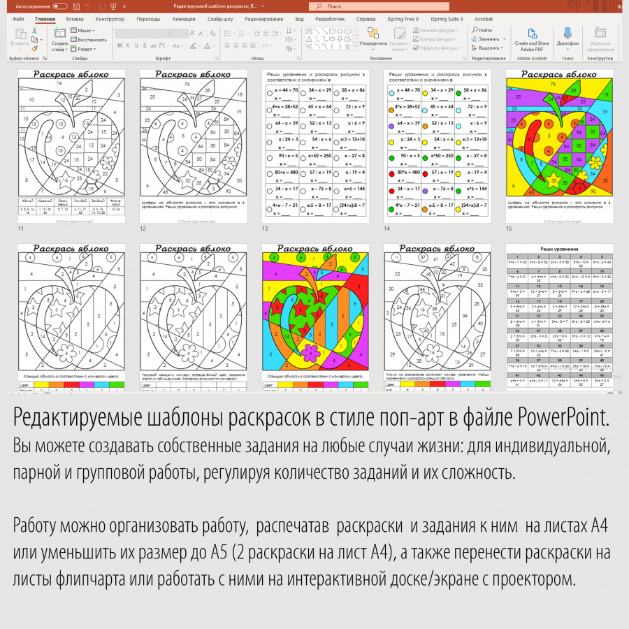 Перед Вами набор раскрасок, в которые можно включать задания как по математике, так и по другим предметам. Шаблоны открывают широкие возможности дифференцированного подхода к группам учащихся с разными возможностями.