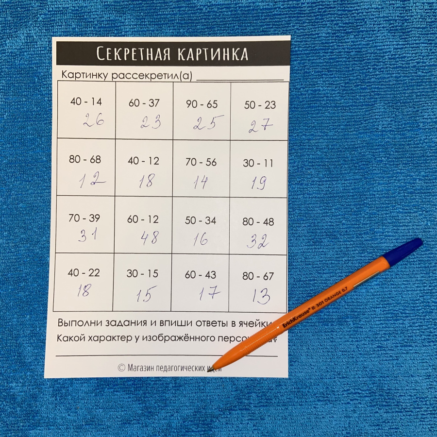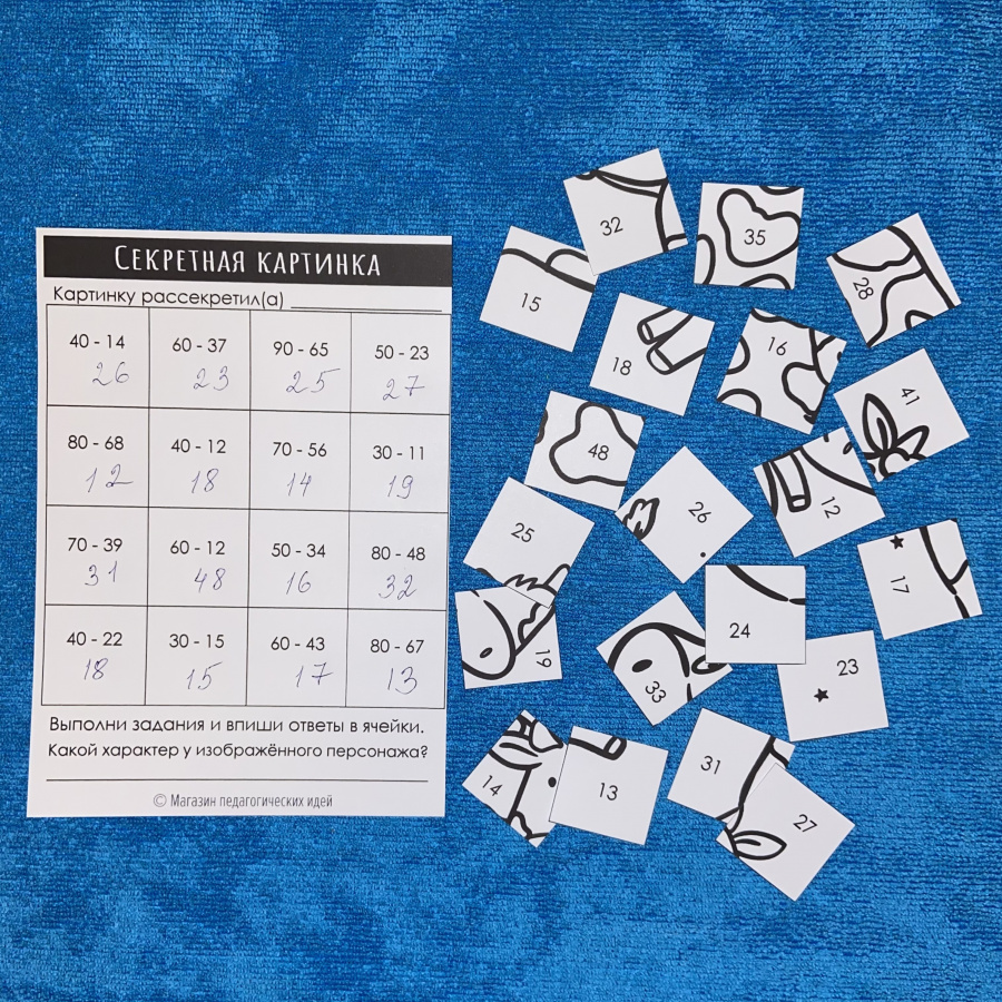 Задание состоит из двух частей: в ячейках левой части - задачи, примеры, вопросы - все, что Вы решите в них разместить, а на карточках правой стороны - ответы. Вначале ребенок получает левую часть страницы, в ячейки которой записывает ответы, а после этого - карточки правой части, и совмещает ответы с заданиями, собирая из фрагментов целую картинку. В каждом варианте четыре лишние карточки, на которые нужно разместить ответы с типичными ошибками.