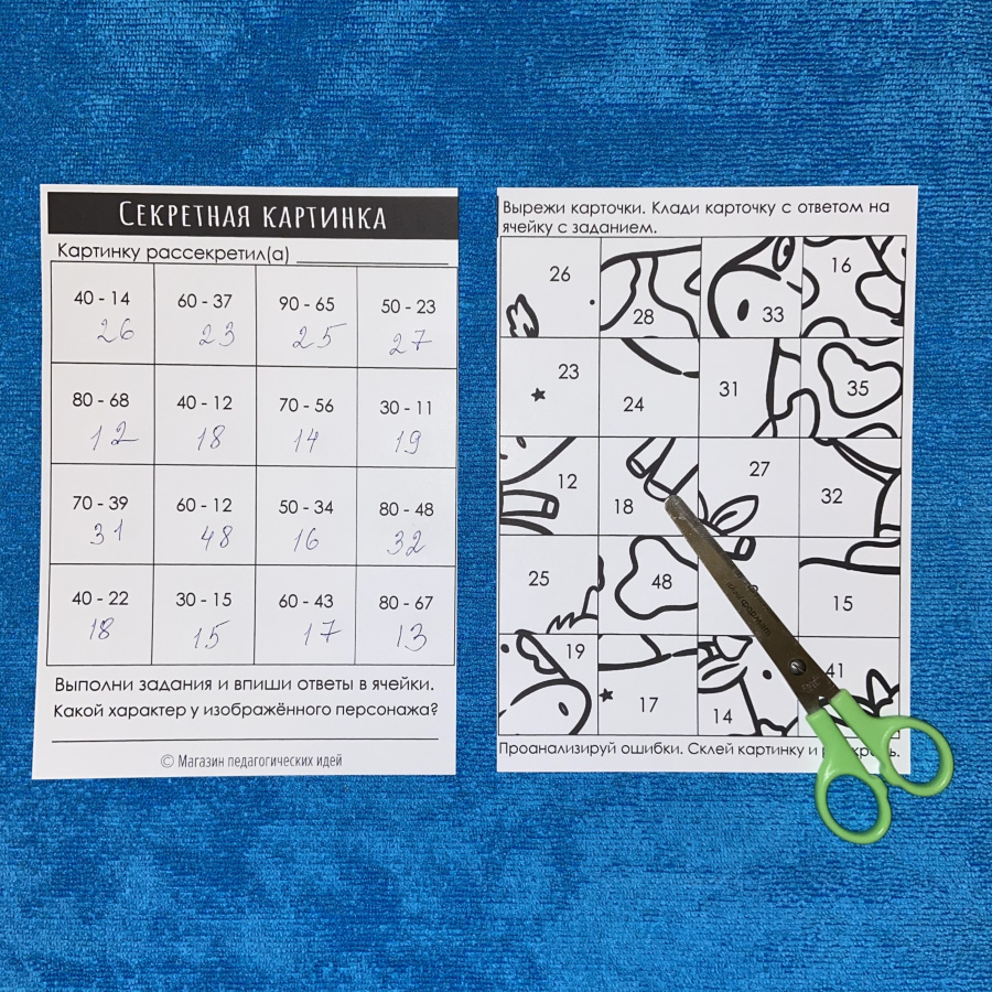 Задание состоит из двух частей: в ячейках левой части - задачи, примеры, вопросы - все, что Вы решите в них разместить, а на карточках правой стороны - ответы. Вначале ребенок получает левую часть страницы, в ячейки которой записывает ответы, а после этого - карточки правой части, и совмещает ответы с заданиями, собирая из фрагментов целую картинку. В каждом варианте четыре лишние карточки, на которые ответы с типичными ошибками.