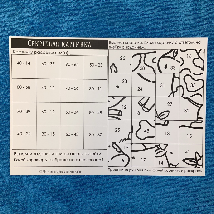 Задание состоит из двух частей: в ячейках левой части - задачи, примеры, вопросы - все, что Вы решите в них разместить, а на карточках правой стороны - ответы. Вначале ребенок получает левую часть страницы, в ячейки которой записывает ответы, а после этого - карточки правой части, и совмещает ответы с заданиями, собирая из фрагментов целую картинку. В каждом варианте четыре лишние карточки, на которые нужно разместить ответы с типичными ошибками.