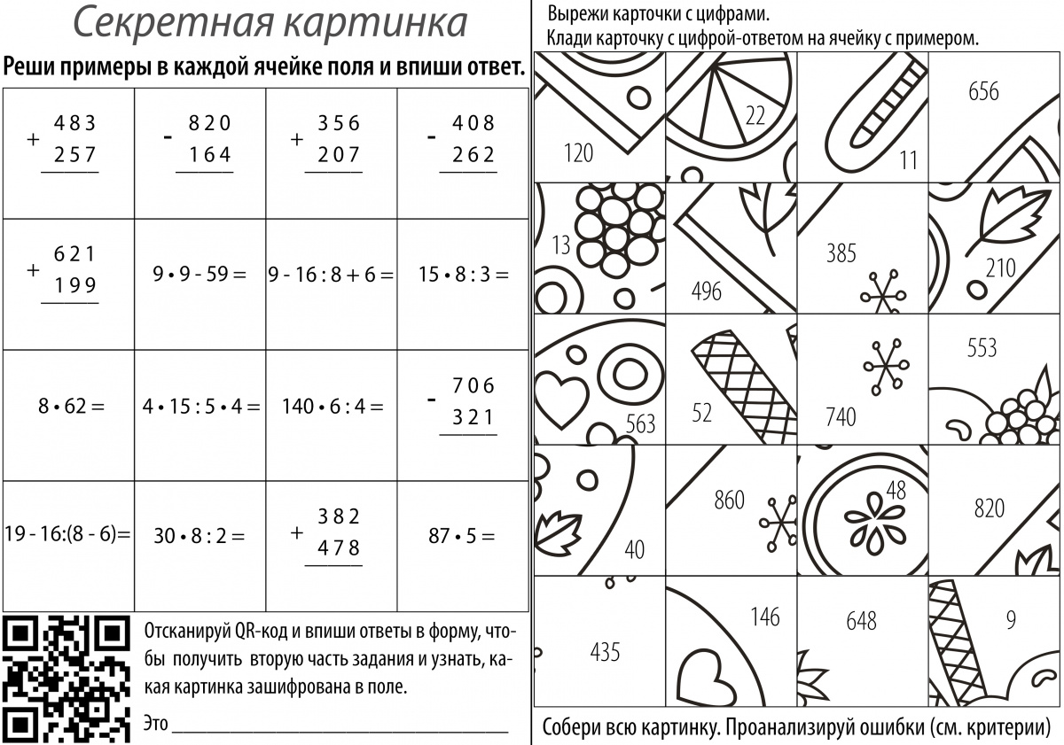 Секретные картинки - это задания, в результате выполнения которых Ваши ученики соберут картинки аппетитных холодных десертов. Задание состоит из двух частей: в ячейках левой части - задачи, примеры, вопросы - все, что Вы решите в них разместить, а на карточках правой стороны - ответы. Вначале ребенок получает левую часть страницы, в ячейки которой записывает ответы, а после этого - карточки правой части, и совмещает ответы с заданиями, собирая из фрагментов целую картинку. В каждом варианте четыре лишние карточки, на которые нужно разместить ответы с типичными ошибками.