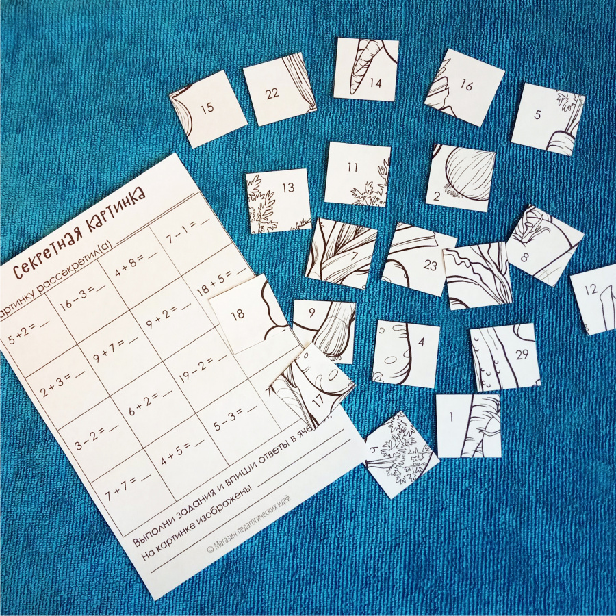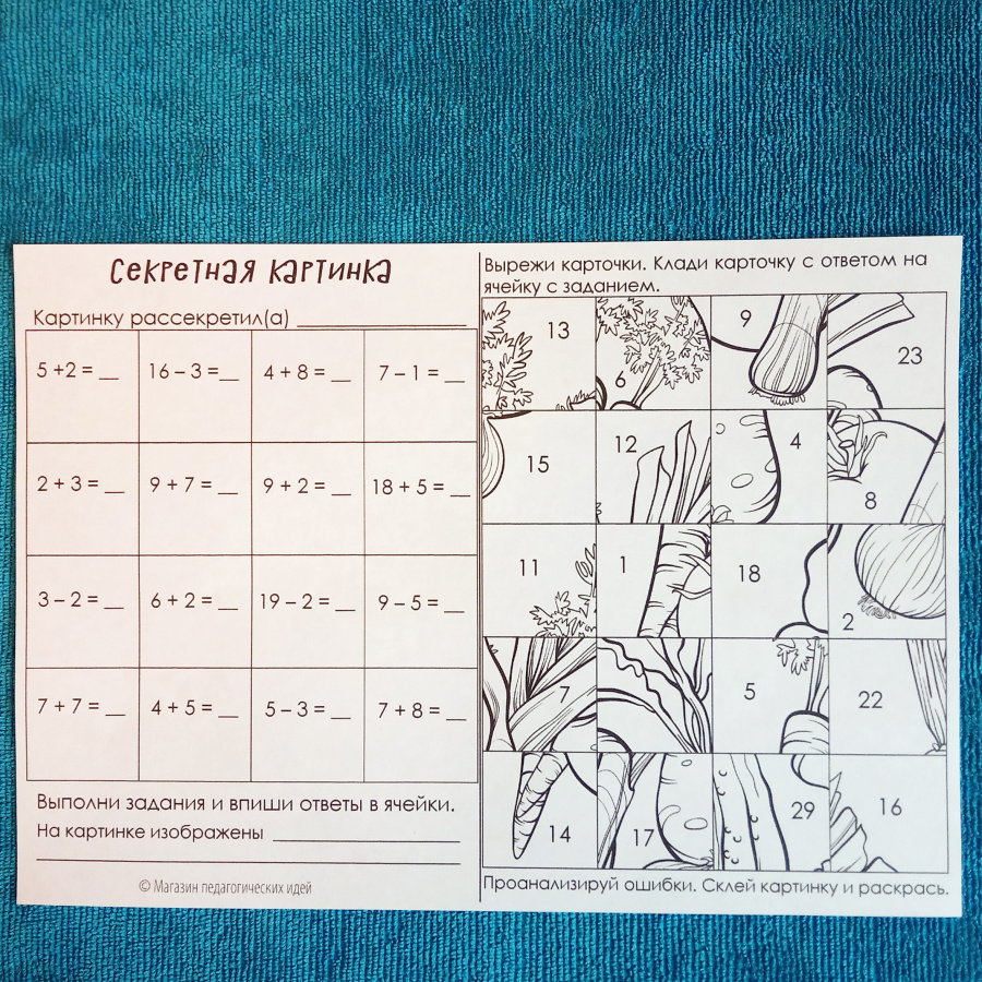 Секретные картинки - это задания, в результате выполнения которых Ваши ученики соберут картинки осенних овощей. Задание состоит из двух частей: в ячейках левой части - задачи, примеры, вопросы - все, что Вы решите в них разместить, а на карточках правой стороны - ответы. Вначале ребенок получает левую часть страницы, в ячейки которой записывает ответы, а после этого - карточки правой части, и совмещает ответы с заданиями, собирая из фрагментов целую картинку. В каждом варианте четыре лишние карточки, на которые нужно разместить ответы с типичными ошибками.