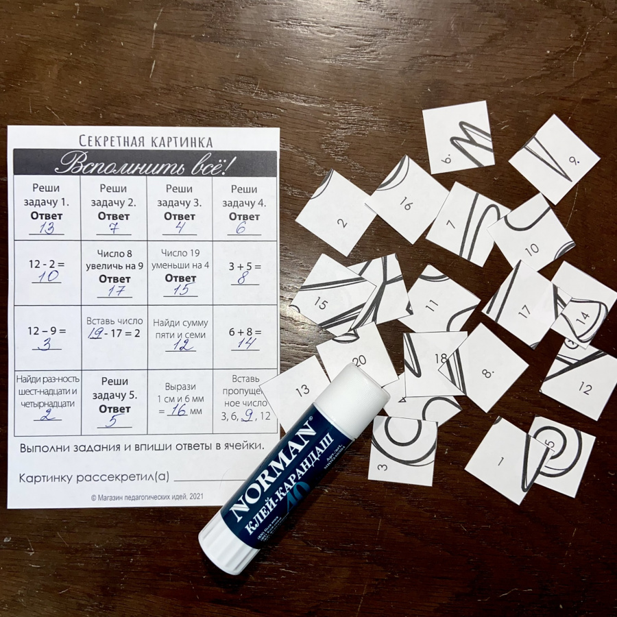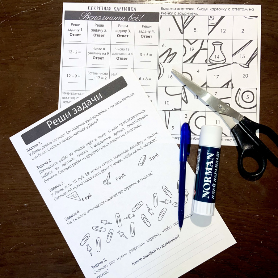 Секретные картинки - это задания, в результате выполнения которых Ваши ученики соберут картинки школьных принадлежностей. Задание состоит из двух частей: в ячейках левой части - задачи, примеры, вопросы - все, что Вы решите в них разместить, а на карточках правой стороны - ответы. Вначале ребенок получает левую часть страницы, в ячейки которой записывает ответы, а после этого - карточки правой части, и совмещает ответы с заданиями, собирая из фрагментов целую картинку. В каждом варианте четыре лишние карточки, на которых ответы с типичными ошибками.