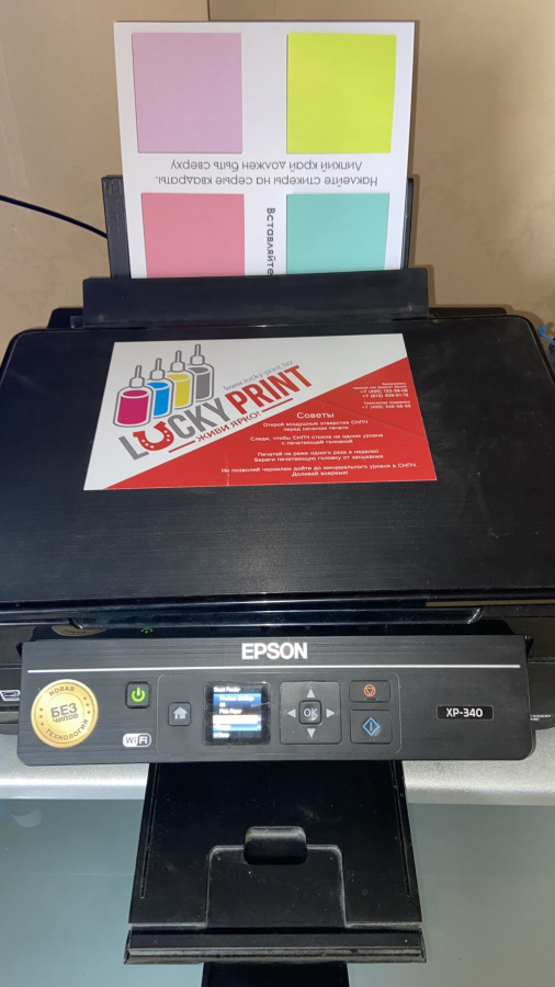 Распечатайте основу для стикеров на листе А4, наклейте цветные стикеры, распечатайте на них нужные Вам надписи. Если используете струйную печать, до дайте краске высохнуть несколько минут.