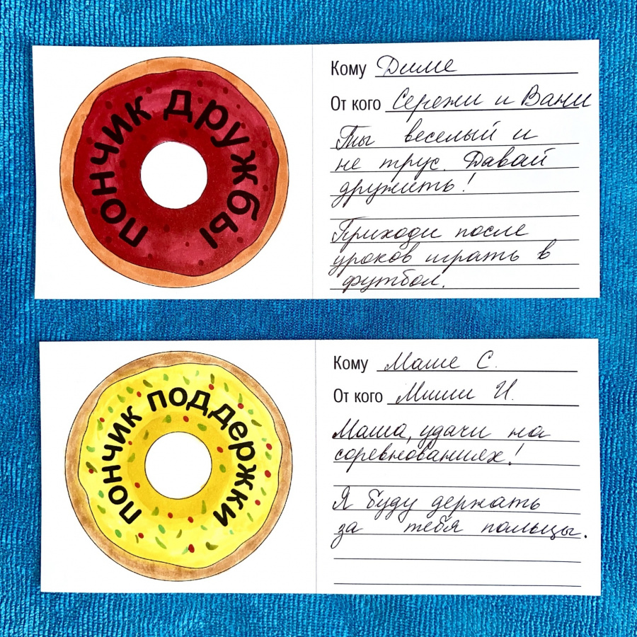 Все остальные шаблоны – это записки с пончиками – такая возможность для стеснительного или косноязычного ребенка попросить прощения, предложить дружбу, поддержать и т.д.