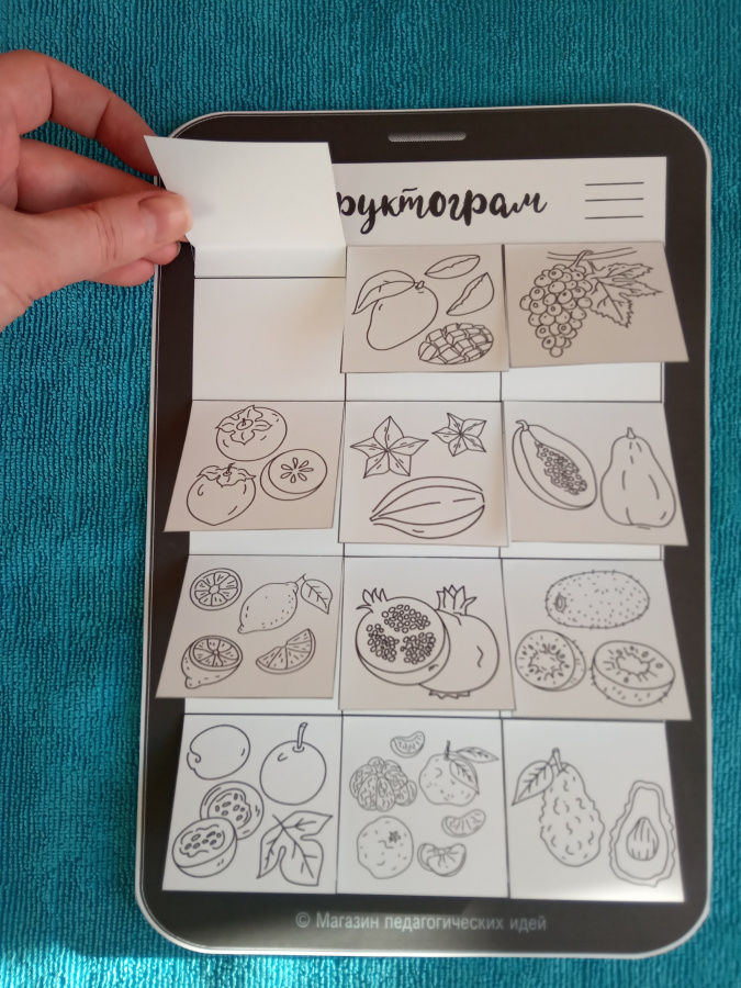 Есть и шаблон, с помощью которого можно зафиксировать информацию о 12 фруктах. Это шаблон с клапанами (контурные рисунки для раскрашивания, цветные изображения, пустые клапаны для свободного творчества), где под клапанами можно написать краткую выжимку - самое-самое о каждом фрукте.